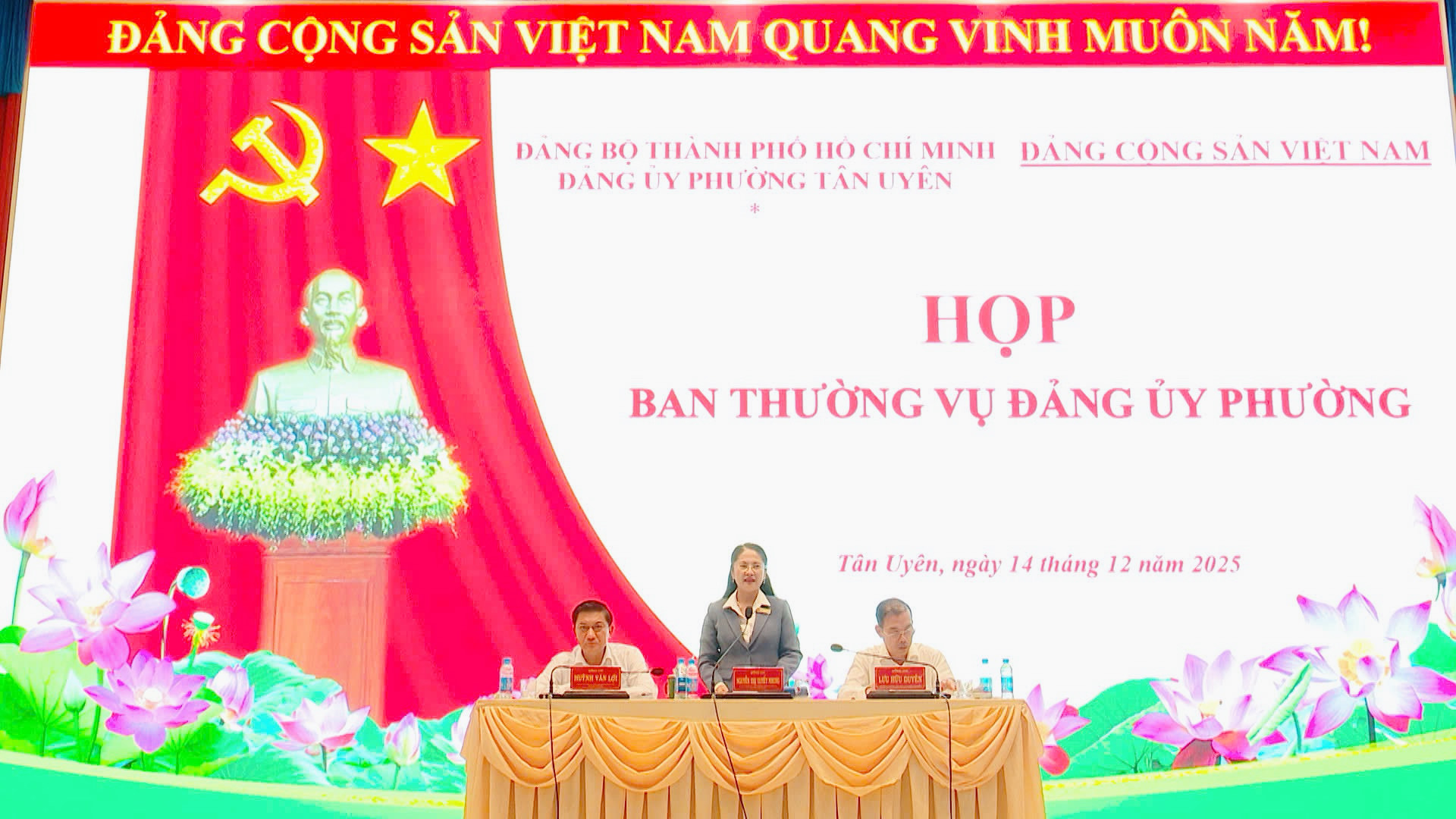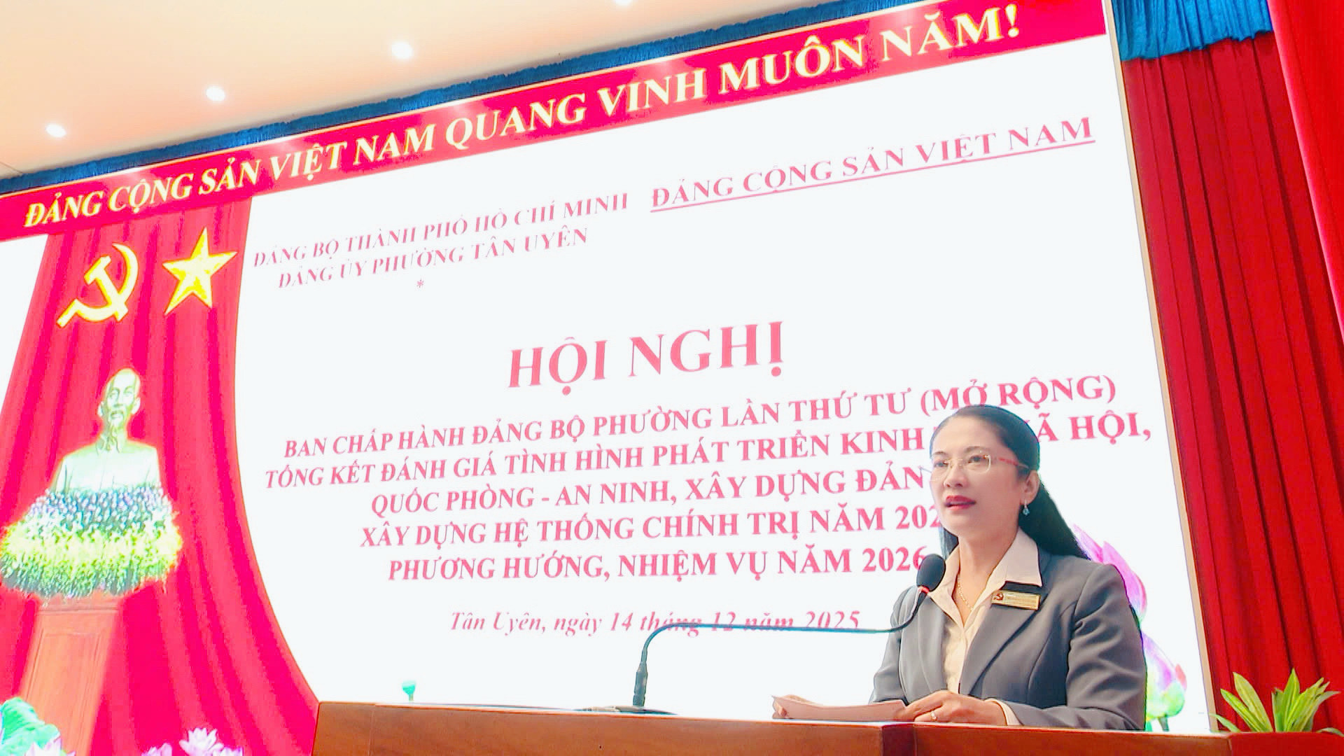 Sáng ngày 14/12, Ban Thường vụ Đảng ủy phường Tân Uyên tổ chức hội nghị Ban Chấp hành Đảng bộ phường lần thứ tư (mở rộng) để tổng kết tình hình phát triển kinh tế - xã hội, quốc phòng - an ninh, xây dựng Đảng, xây dựng hệ thống chính trị năm 2025, xác định phương hướng, nhiệm vụ năm 2026. Đại biểu Thành phố Hồ Chí Minh dự hội nghị có đồng chí Trần Minh Xuân - Phó Trưởng Ban Nội chính Thành uỷ, đồng chí Phạm Thành Trung - Trưởng phòng Nghiệp vụ 3, cơ quan Uỷ ban Kiểm tra Thành uỷ, đồng chí Vũ Thị Hồng Loan - Chuyên viên chính Phòng Dân tộc, Tôn giáo, Ban Tuyên giáo và Dân vận Thành uỷ; cùng lãnh đạo các cơ quan, đơn vị Thành phố đóng trên địa bàn.