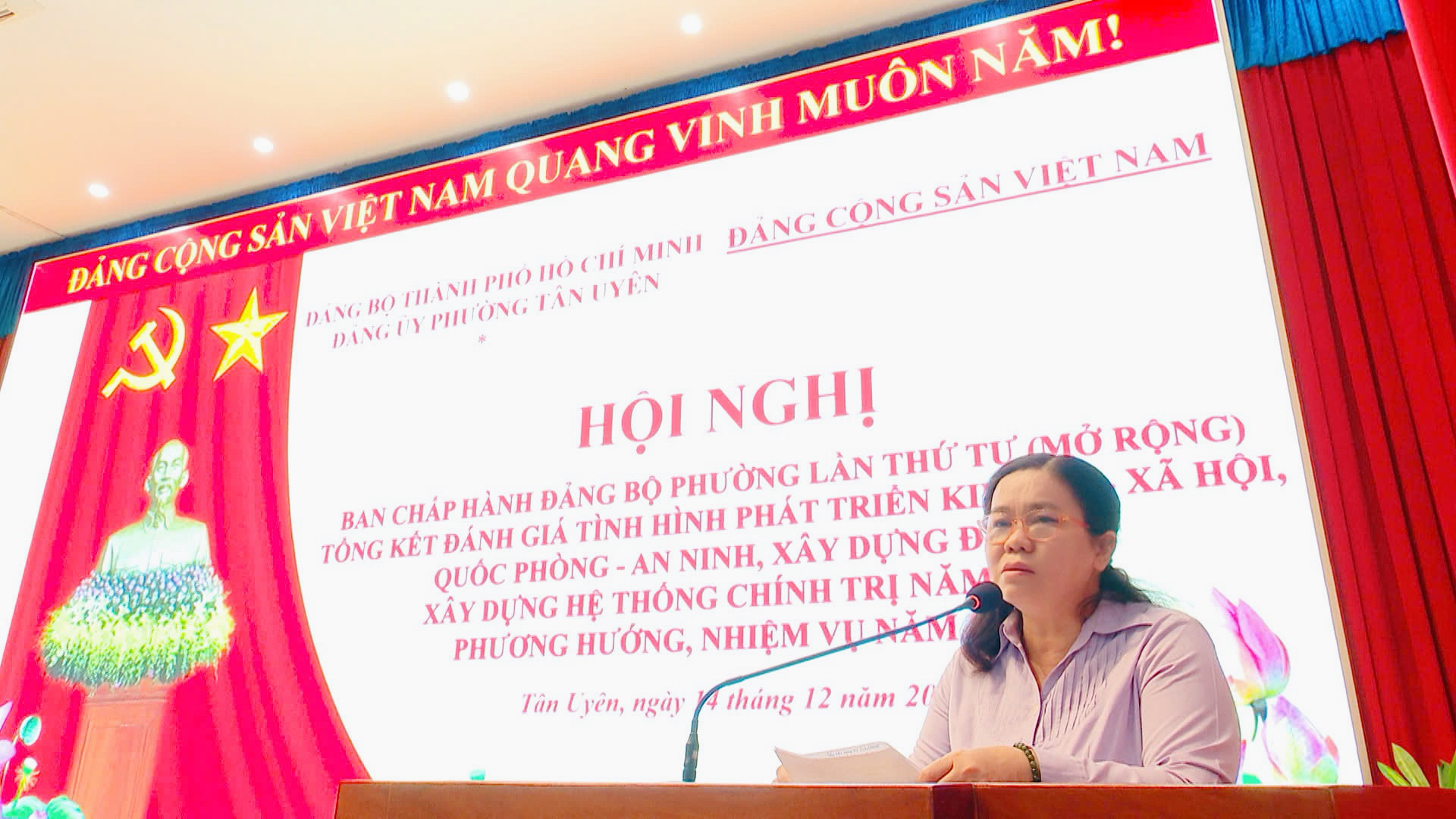 Lãnh đạo phường Tân Uyên dự hội nghị có đồng chí Nguyễn Thị Tuyết Nhung - Bí thư Đảng ủy, Chủ tịch Hội đồng nhân dân phường, chủ trì Hội nghị, đồng chí Lưu Hữu Duyên - Phó Bí thư Thường trực Đảng ủy, Giám đốc Trung tâm Chính trị phường, đồng chí Huỳnh Văn Lợi - Phó Bí thư Đảng ủy, Chủ tịch Ủy ban nhân dân phường; cùng các đồng chí Ủy viên Ban Thường vụ Đảng ủy, Ủy viên Ban chấp hành Đảng bộ phường; Lãnh đạo các cơ quan chuyên trách tham mưu, giúp việc Đảng ủy, Trung tâm Chính trị phường, các Ban, Phòng chuyên môn, đơn vị sự nghiệp trực thuộc Hội đồng nhân dân, Uỷ ban nhân dân phường; Ban Thường trực Ủy ban Mặt trận Tổ quốc Việt Nam phường; Hiệu trưởng các trường Trung học phổ thông, Trung học cơ sở, Tiểu học - Trung học cơ sở, Tiểu học và Mầm non công lập; Bí thư các Chi, Đảng bộ trực thuộc.
