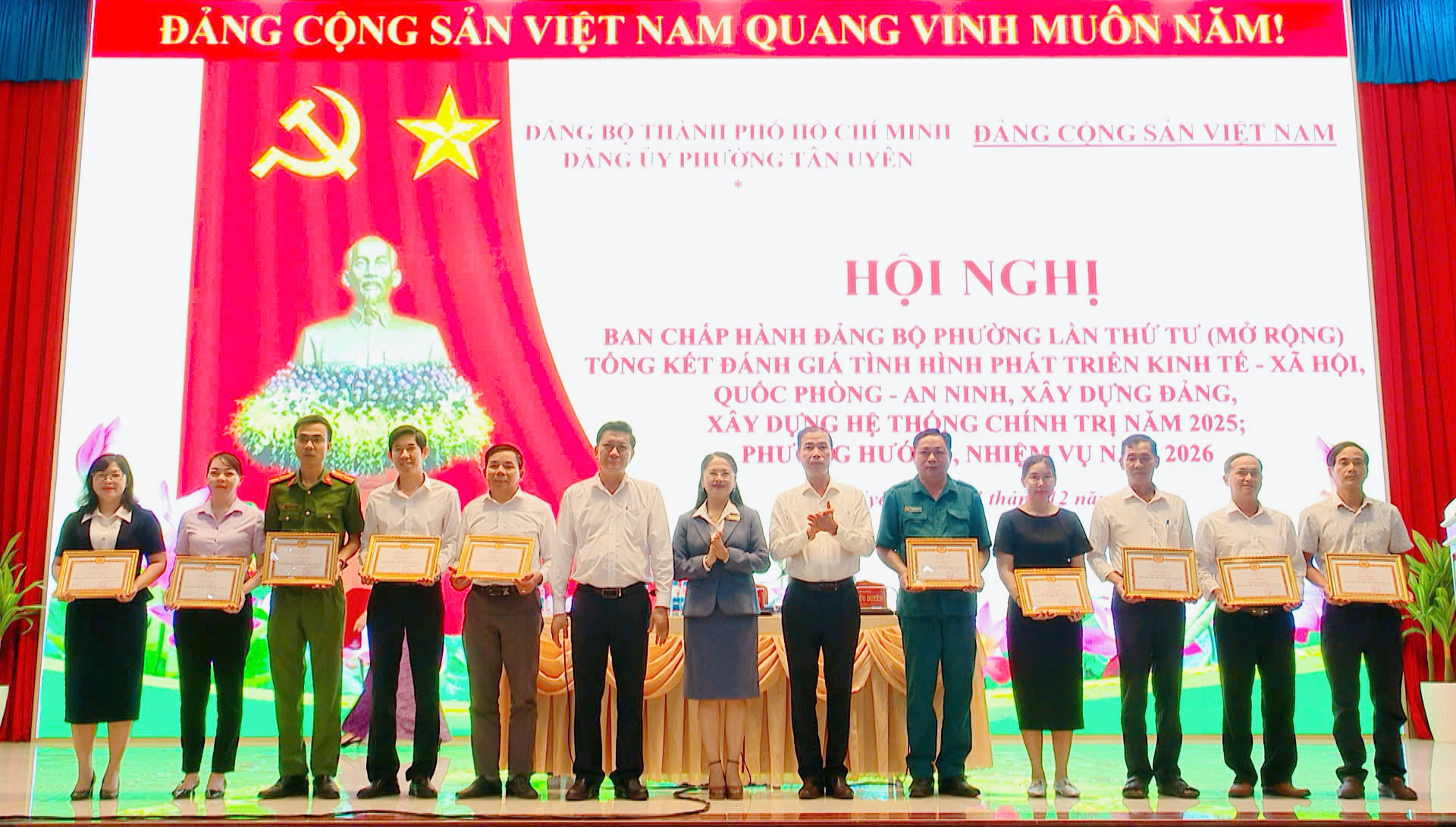 Dịp này, Ban Thường vụ Đảng uỷ phường Tân Uyên tặng giấy khen cho 10 tổ chức đảng trực thuộc Đảng ủy phường đạt tiêu chuẩn Hoàn thành xuất sắc nhiệm vụ năm 2025.
