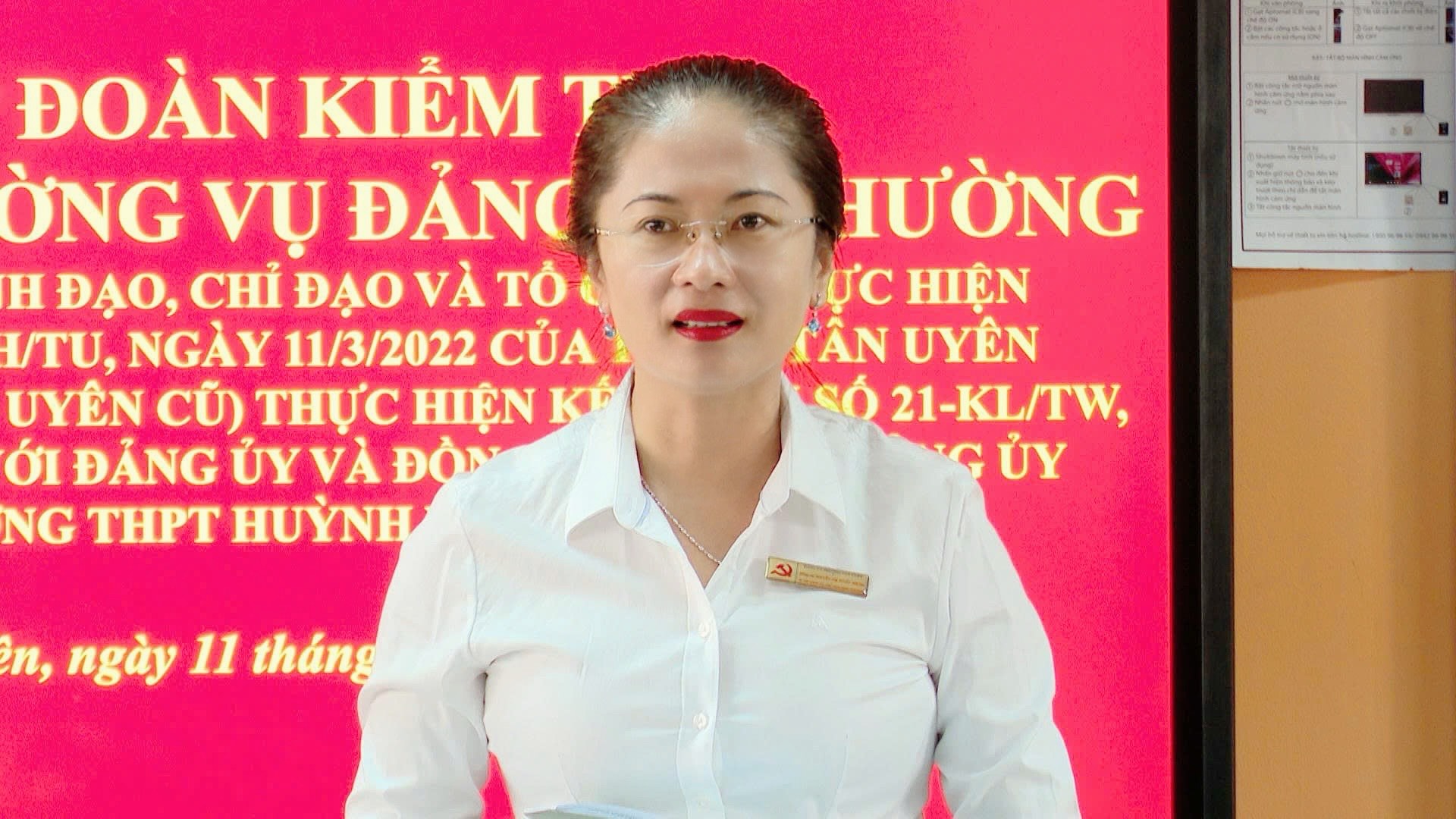 Phát biểu kết thúc buổi kiểm tra, đồng chí Nguyễn Thị Tuyết Nhung - Bí thư Đảng uỷ, Chủ tịch Hội đồng nhân dân phường Tân Uyên đánh giá, Đảng uỷ trường THPT Huỳnh Văn Nghệ đã đạt nhiều kết quả quan trọng trong thực hiện Kế hoạch số 104-KH/TU, ngày 11/3/2022 của Thị ủy Tân Uyên (trước đây là Thành ủy Tân Uyên cũ) thực hiện Kết luận số 21-KL/TW, ngày 25/10/2021 của Ban Chấp hành Trung ương. Công tác tổ chức, quán triệt, triển khai được thực hiện chủ động, kịp thời, thể hiện vai trò của đồng chí Bí thư và Ban Thường vụ tham mưu cho Ban Chấp hành. Công tác tổ chức toạ đàm chuyên đề; số hoá, quản lý hồ sơ đảng viên là những ưu điểm nổi bật mà Đảng uỷ trường đã thực hiện, có thể triển khai nhân rộng. Bên cạnh đó, đồng chí đề nghị Đảng uỷ trường tăng cường hơn nữa công tác kiểm tra, giám sát,xây dựng chương trình và triển khai thực hiện đúng chức năng, nhiệm vụ, quyền hạn, thời gian.