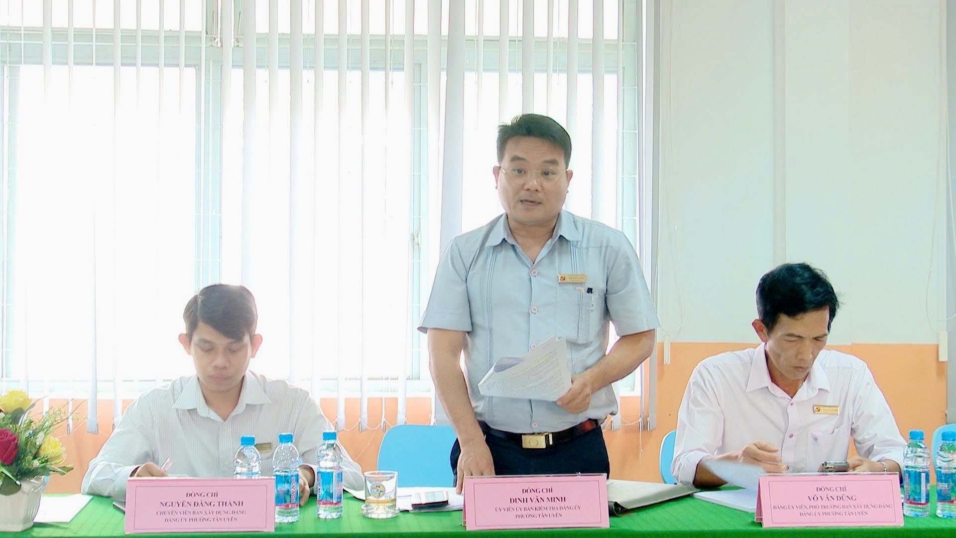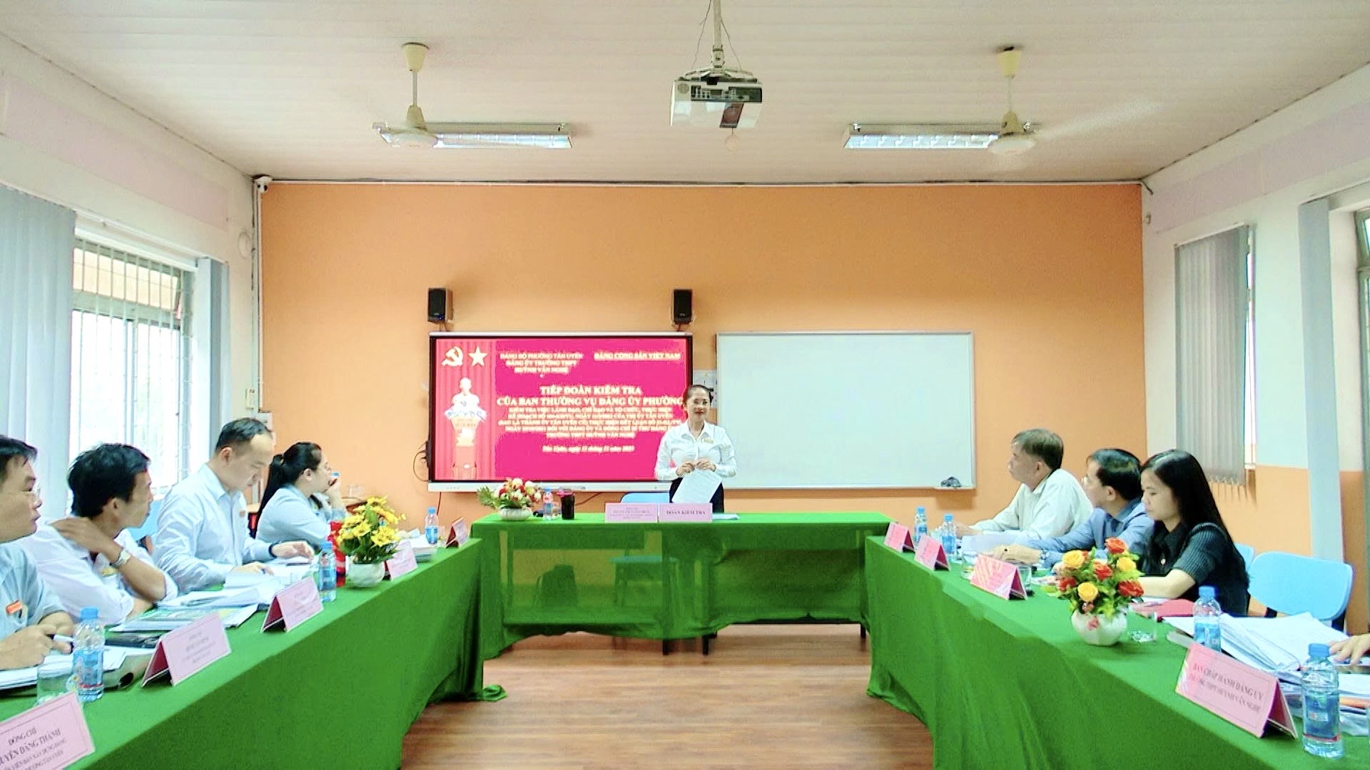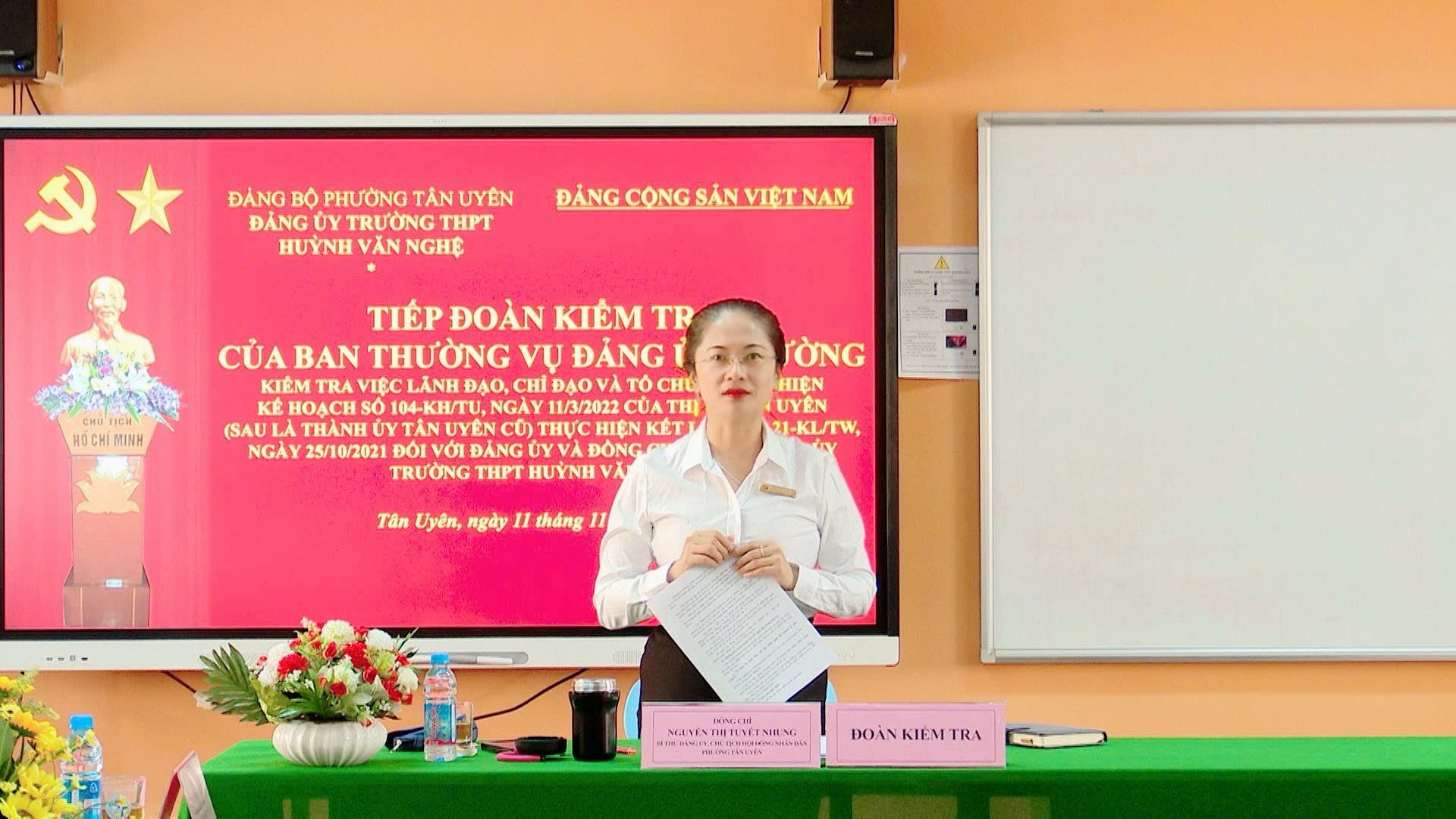 Đồng chí Nguyễn Thị Tuyết Nhung - Bí thư Đảng uỷ, Chủ tịch Hội đồng nhân dân phường Tân Uyên, Trưởng đoàn kiểm tra chủ trì buổi kiểm tra. Cùng dự có đồng chí Nguyễn Thị Hải Bình - Uỷ viên Ban Thường vụ, Trưởng Ban Xây dựng Đảng, Phó Trưởng đoàn kiểm tra và các đồng chí thành viên đoàn kiểm tra. Tiếp và làm việc với đoàn có đồng chí Nguyễn Tấn Tài - Bí thư Đảng uỷ, Hiệu trưởng Trường THPT Huỳnh Văn Nghệ cùng các đồng chí trong Ban Thường vụ, Ban Chấp hành Đảng uỷ Trường THPT Huỳnh Văn Nghệ.