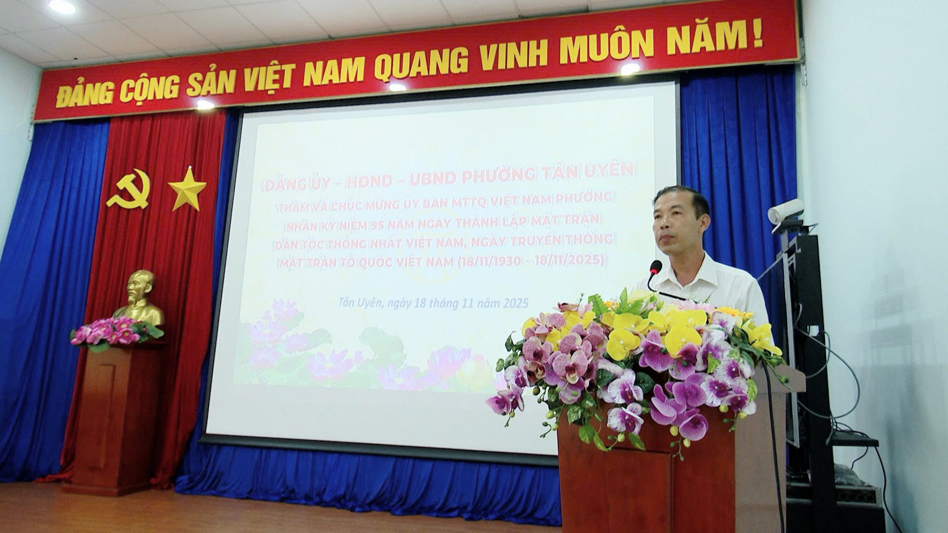 Chiều ngày 18/11/2025, Đoàn công tác của Đảng uỷ - Hội đồng nhân dân - Uỷ ban nhân dân phường Tân Uyên đã đến thăm và chúc mừng Uỷ ban Mặt trận Tổ quốc Việt Nam phường nhân kỷ niệm 95 năm Ngày thành lập Mặt trận Dân tộc thống nhất Việt Nam - Ngày truyền thống Mặt trận Tổ quốc Việt Nam (18/11/1930 - 18/11/2025). Tham dự có đồng chí Nguyễn Thị Tuyết Nhung - Bí thư Đảng uỷ, Chủ tịch Hội đồng nhân dân phường Tân Uyên, đồng chí Lưu Hữu Duyên - Phó Bí thư Thường trực Đảng uỷ, Giám đốc Trung tâm Chính trị phường cùng các đồng chí trong Ban Thường vụ Đảng uỷ, lãnh đạo các cơ quan.