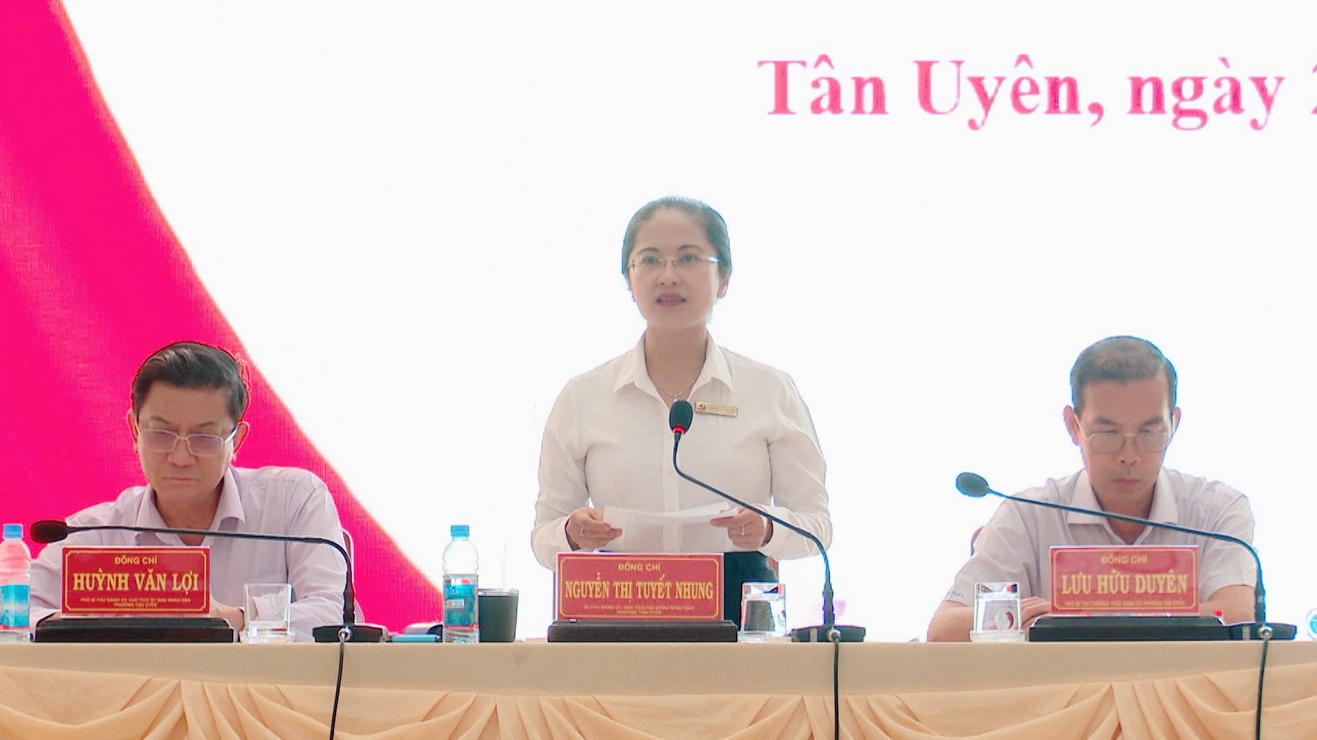 Đồng chí Nguyễn Thị Tuyết Nhung - Bí thư Đảng uỷ, Chủ tịch Hội đồng nhân dân phường Tân Uyên chủ trì hội nghị. Cùng dự có đồng chí Lưu Hữu Duyên - Phó Bí thư Thường trực Đảng uỷ, Giám đốc Trung tâm Chính trị phường, đồng chí Huỳnh Văn Lợi - Phó Bí thư Đảng uỷ, Chủ tịch Uỷ ban nhân dân phường cùng các đồng chí trong Ban Thường vụ Đảng uỷ.