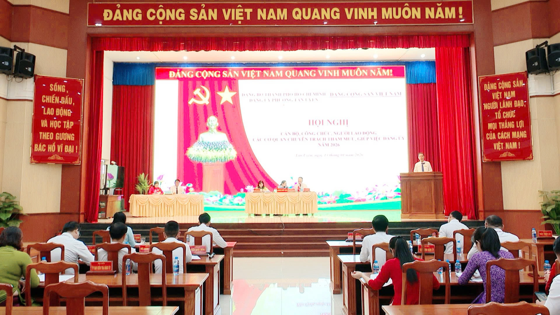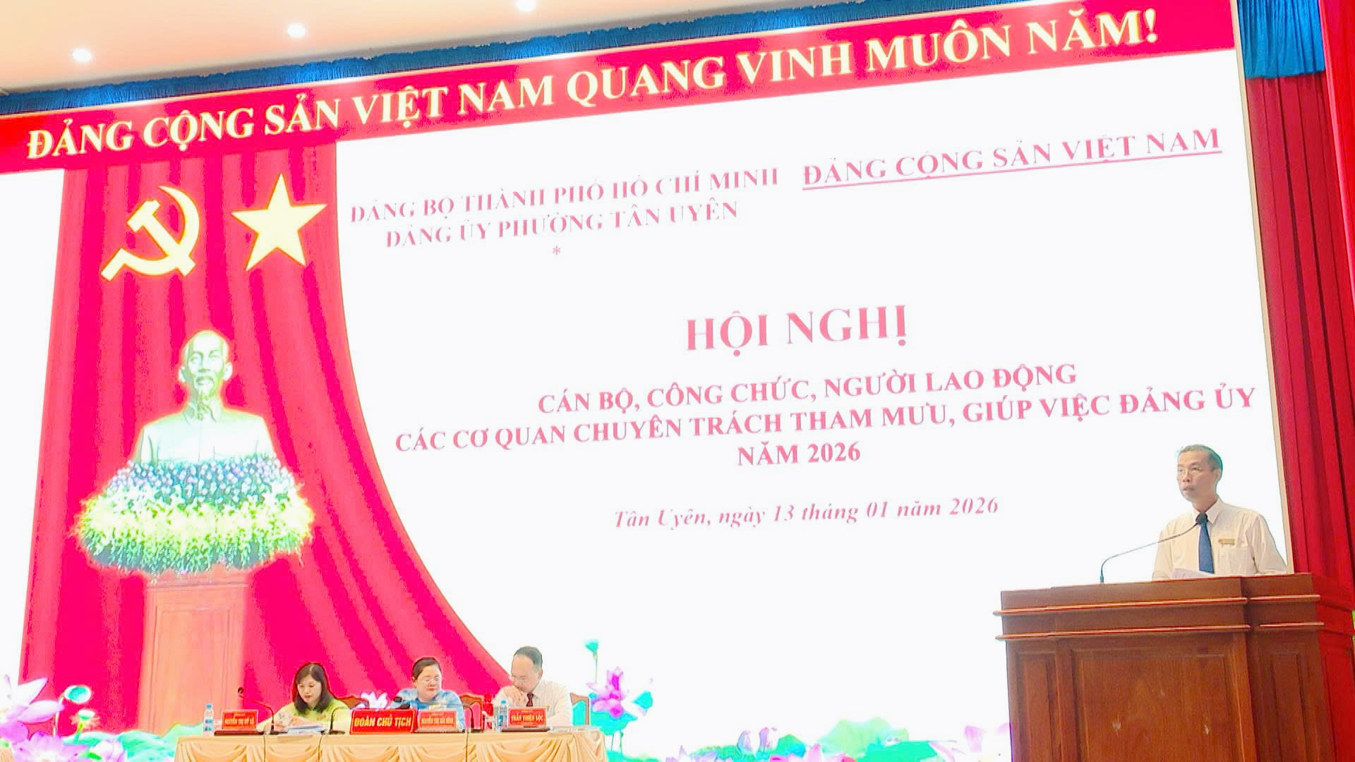 Sáng ngày 13/01, các cơ quan chuyên trách tham mưu, giúp việc của Đảng ủy phối hợp tổ chức Hội nghị cán bộ, công chức, người lao động các cơ quan tham mưu giúp việc Đảng ủy phường Tân Uyên năm 2026. Đến dự hội nghị có đồng chí Lưu Hữu Duyên - Phó Bí thư Thường trực Đảng ủy, Giám đốc Trung tâm Chính trị phường, đồng chí Nguyễn Thị Hải Bình - Ủy viên Ban Thường vụ, Trưởng Ban Xây dựng Đảng, đồng chí Nguyễn Thị Mỹ Lệ - Ủy viên Ban Thường vụ, Chủ nhiệm Ủy ban Kiểm tra Đảng ủy cùng các đồng chí lãnh đạo, cán bộ, công chức, người lao động các cơ quan chuyên trách tham mưu, giúp việc Đảng ủy.