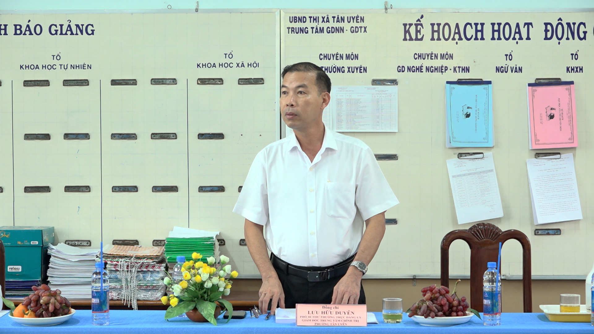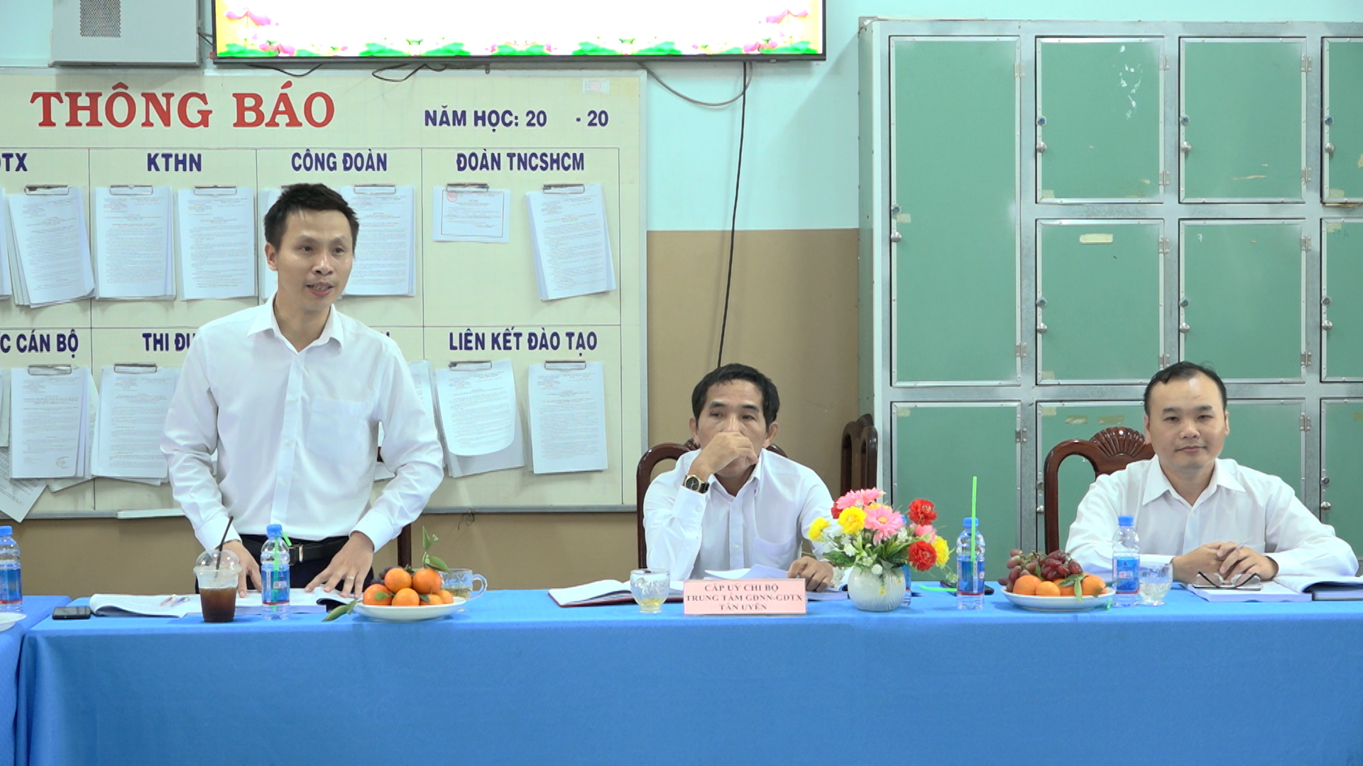 Sáng ngày 02/12, Chi bộ Trung tâm Giáo dục nghề nghiệp-Giáo dục thường xuyên (GDNN-GDTX) Tân Uyên tổ chức hội nghị kiểm điểm đánh giá, xếp loại chất lượng tổ chức đảng, đảng viên năm 2025. Dự hội nghị có đồng chí Lưu Hữu Duyên - Phó Bí thư Thường trực Đảng ủy, Giám đốc Trung tâm Chính trị phường; đồng chí Phạm Đỗ Huệ Tâm - Phó Chánh Văn phòng Đảng uỷ; đồng chí Nguyễn Văn Ty - Bí thư Chi bộ Trung tâm cùng các đồng chí đảng viên trong Chi bộ Trung tâm.