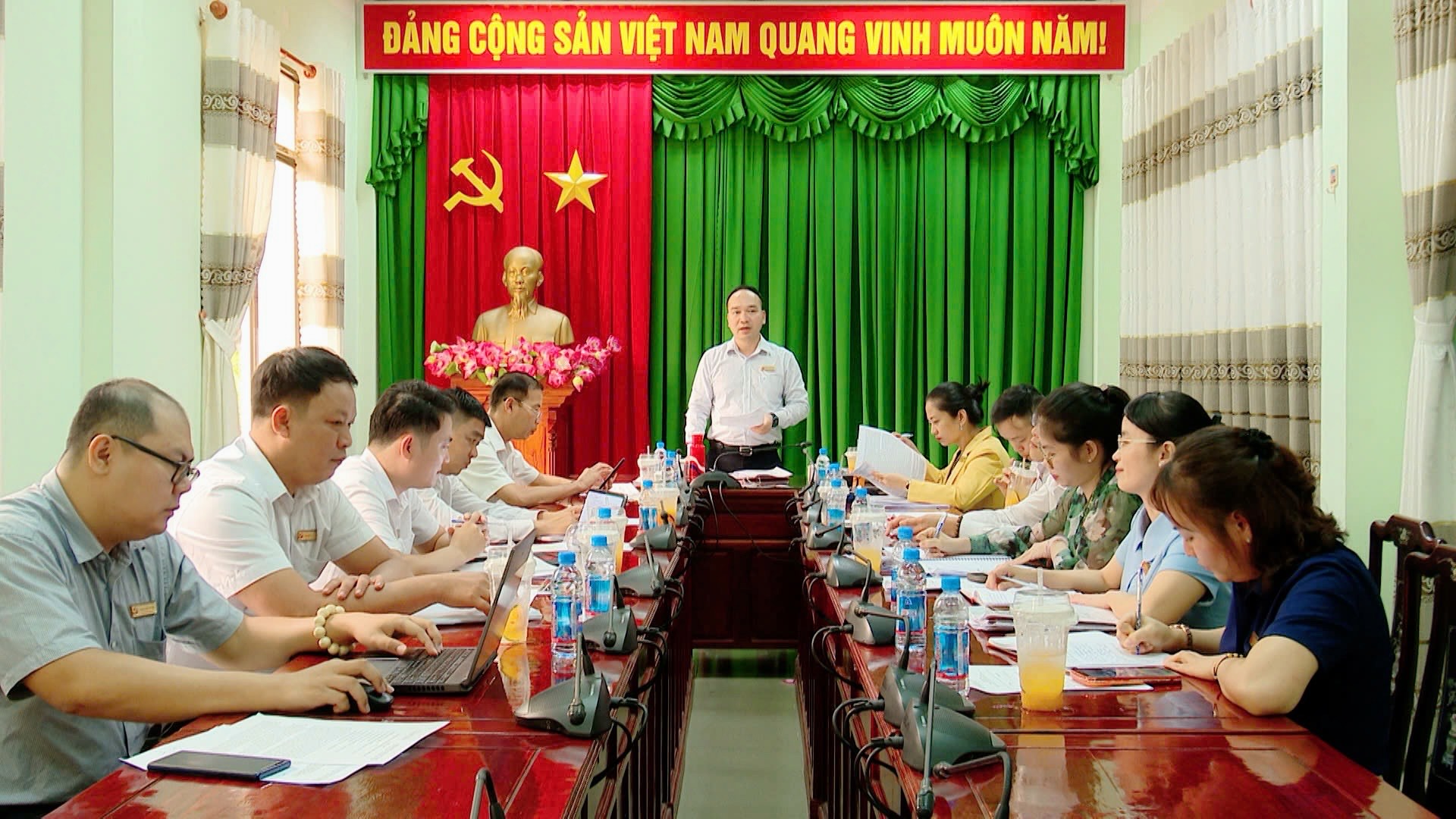 Cùng với đó, cuộc họp tiến hành các nội dung: kể chuyện theo tư tưởng, đạo đức, phong cách Hồ Chí Minh “Bác Hồ đến thăm vườn hoa nghìn việc tốt”; thông báo tình hình nộp đảng phí; một số nội dung thông tin, định hướng tuyên truyền; thực hiện quy trình kiểm tra 1 đảng viên về về việc thực hiện chức trách nhiệm vụ được phân công, giám sát 1 đảng viên về việc thực hiện Quy định số 144-QĐ/TW, ngày 09/5/2024 về “Chuẩn mực đạo đức cách mạng của cán bộ, đảng viên trong giai đoạn mới” và Hướng dẫn số 159-HD/BTGTW, ngày 03/7/2024 của Ban Tuyên giáo Trung ương; lãnh đạo Văn phòng Đảng uỷ báo cáo Chi bộ đánh giá kết quả công tác của các cá nhân để chi thu nhập tăng thêm; tự phê bình, phê bình.