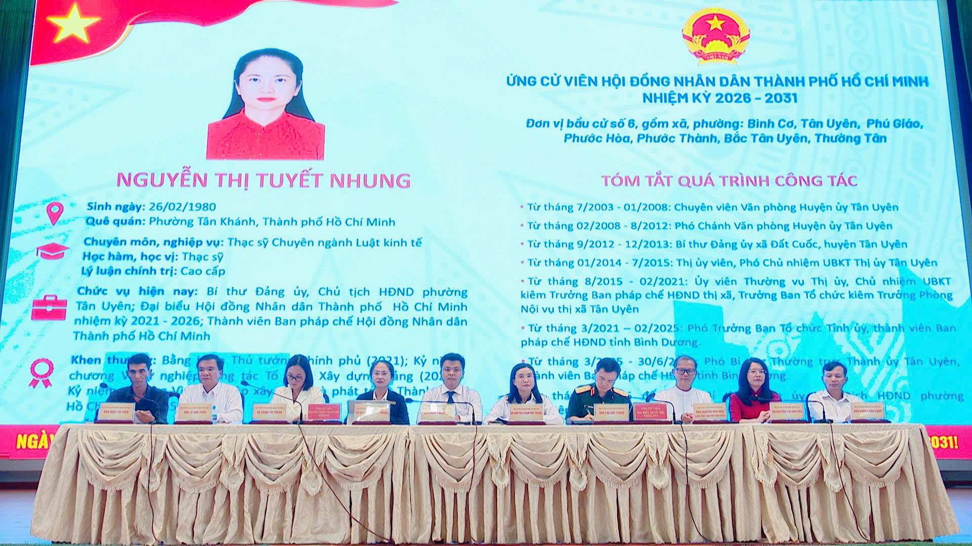 Những người ứng cử đại biểu HĐND Thành phố khóa XI, nhiệm kỳ 2026 - 2031 gồm: ông Lê Anh Tuấn - Phó Trưởng Ban Kinh tế Ngân sách Hội đồng nhân dân Thành phố Hồ Chí Minh; bà Nguyễn Thị Tuyết Nhung - Bí thư Đảng ủy, Chủ tịch Hội đồng nhân dân phường Tân Uyên, Thành viên Ban Pháp chế Hội đồng nhân Thành phố; bà Trịnh Thị Trang - Phó Trưởng phòng Công tác Hội đồng nhân dân, Văn phòng Đoàn đại biểu Quốc hội và Hội đồng nhân dân Thành phố Hồ Chí Minh; ông Tống Thành Hậu - Bí thư Đoàn TNCS Hồ Chí Minh, Viên chức Phòng Công tác Chính trị - Học sinh, sinh viên Trường Cao đẳng Kỹ thuật Cao Thắng; ông Ngưu Trí Tuấn - Làm nông tại xã Phú Giáo, Thành phố Hồ Chí Minh.