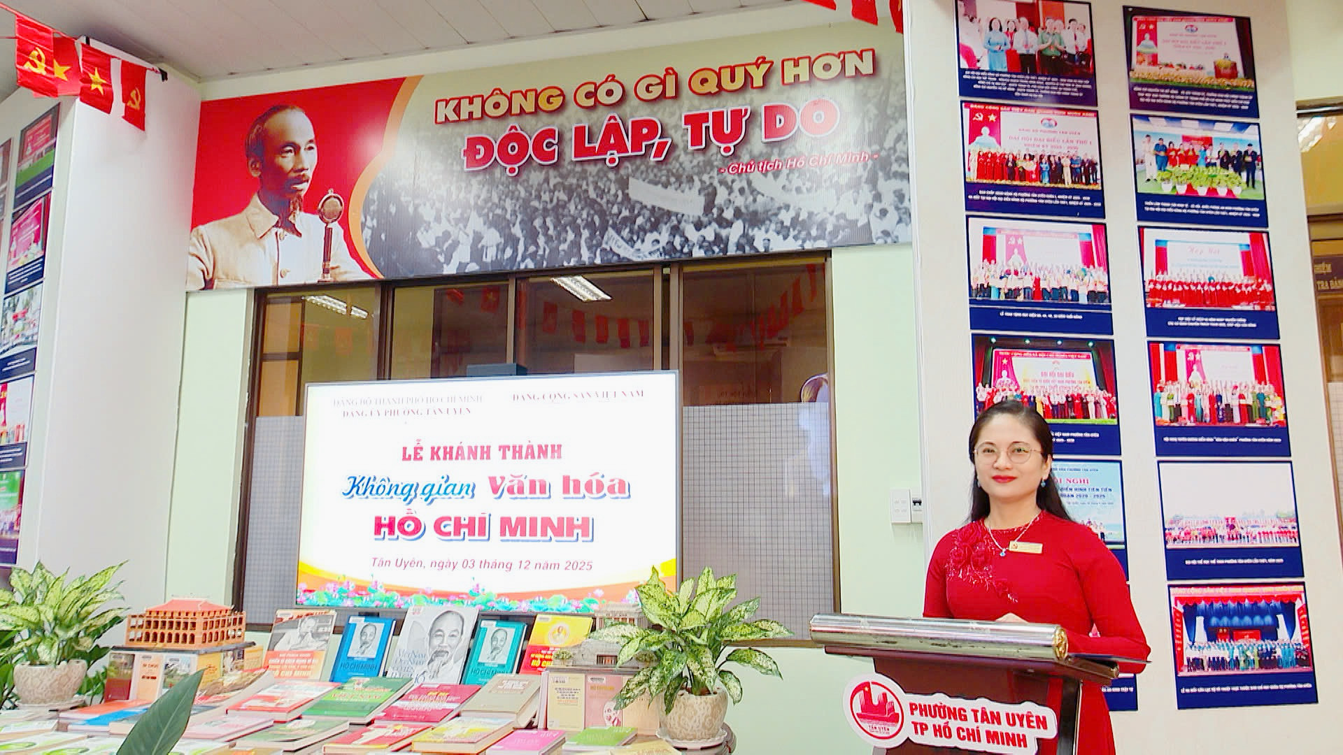 Không gian văn hóa Hồ Chí Minh tại Trụ sở Đảng ủy phường có diện tích hơn 70m², được đầu tư bài bản, gồm hệ thống các pa-nô giới thiệu thân thế, sự nghiệp cách mạng của Chủ tịch Hồ Chí Minh, các danh ngôn của Người và những đánh giá tiêu biểu của nhân dân, bạn bè quốc tế; trưng bày sách, hình ảnh hoạt động tiêu biểu của phường Tân Uyên sau sáp nhập, mô hình Bến Nhà Rồng, Lăng Chủ tịch Hồ Chí Minh và khu vực trình chiếu tư liệu số. Tổng thể không gian được thiết kế trang trọng, giản dị, gần gũi, giàu giá trị giáo dục, trở thành minh chứng sinh động cho ý chí, quyết tâm, sự đồng lòng của toàn Đảng bộ, Nhân dân phường trong học tập và làm theo Bác.