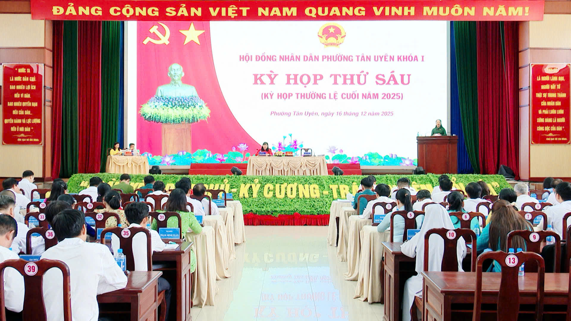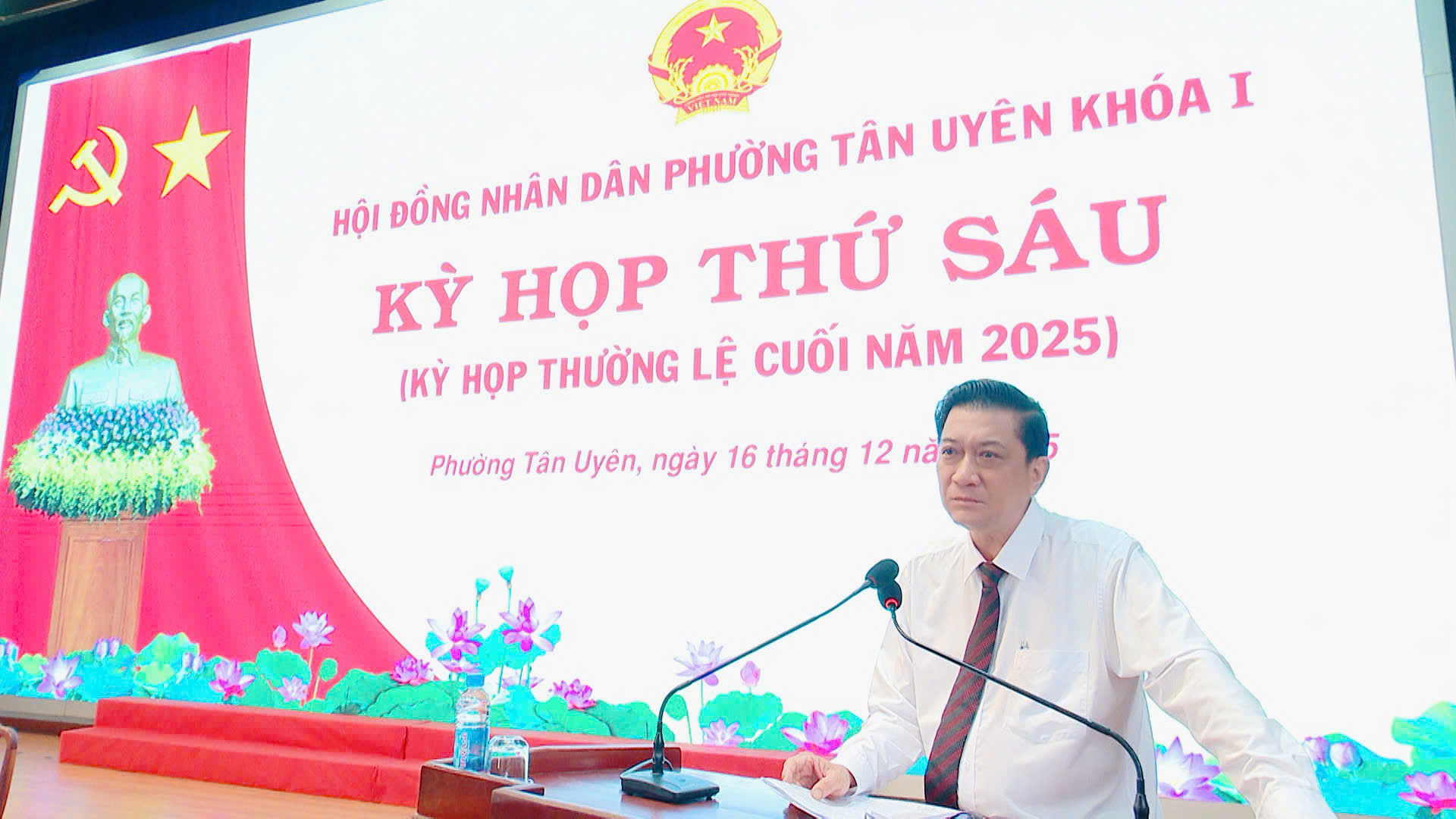 Sáng ngày 16/12, HĐND phường Tân Uyên tổ chức Kỳ họp thứ sáu - Kỳ họp thường lệ cuối năm 2025. Đây là kỳ họp có ý nghĩa quan trọng, nhằm đánh giá toàn diện kết quả thực hiện nhiệm vụ phát triển kinh tế - xã hội, quốc phòng - an ninh năm 2025; đồng thời xem xét, thảo luận và quyết định các nội dung quan trọng theo thẩm quyền, làm cơ sở định hướng nhiệm vụ phát triển của phường trong năm 2026 và giai đoạn tiếp theo. Bà Nguyễn Thị Tuyết Nhung - Bí thư Đảng uỷ, Chủ tịch HĐND phường Tân Uyên, chủ toạ kỳ họp.