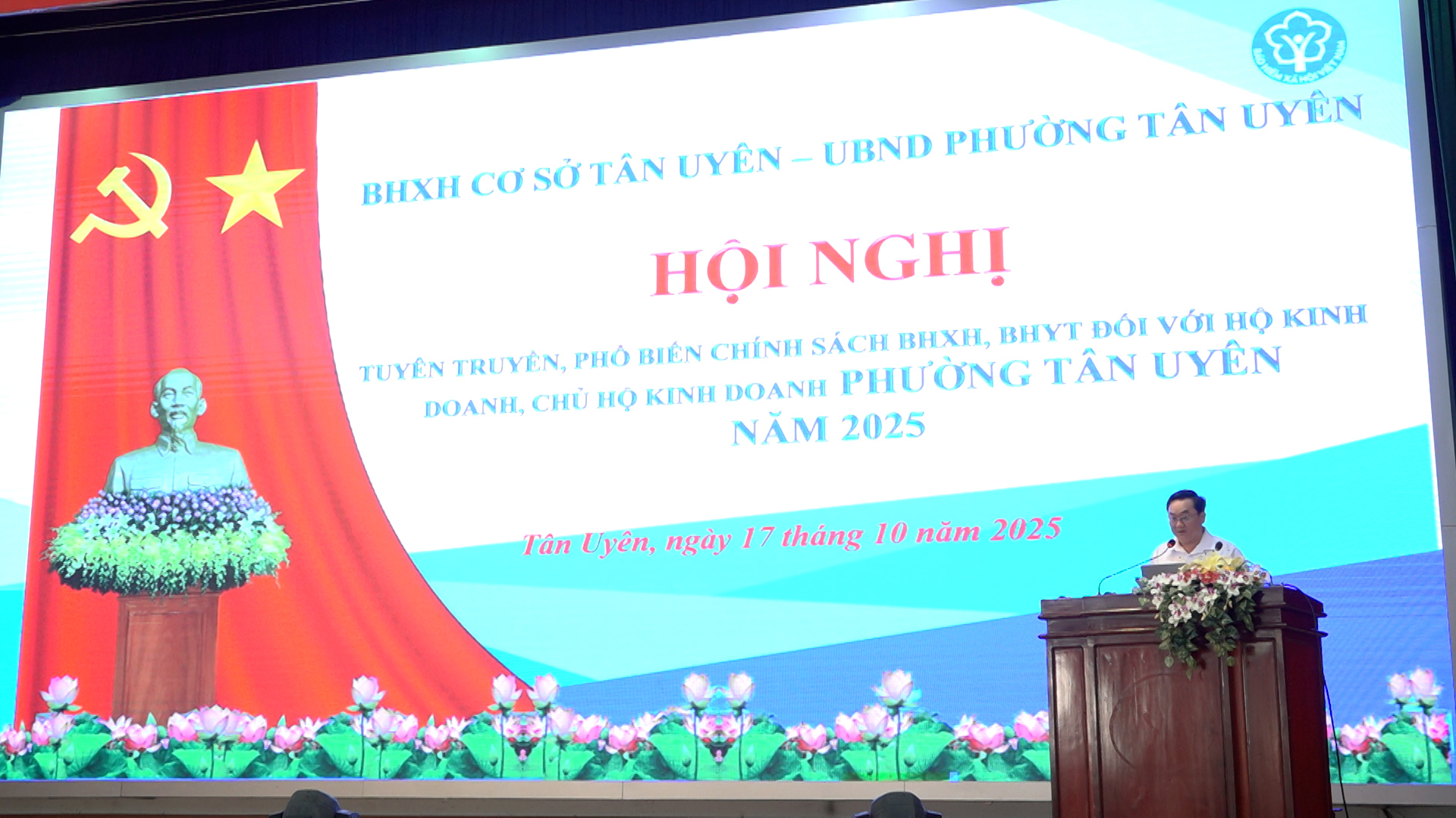 Sáng ngày 17/10, BHXH cơ sở Tân Uyên tổ chức hội nghị tuyên truyền, phổ biến chính sách BHXH, BHYT cho hơn 250 hộ kinh doanh, chủ hộ kinh doanh trên địa bàn phường. Đến dự hội nghị có ông Lê Duy Hậu - Uỷ viên Thường vụ, Phó Chủ tịch UBND phường Tân Uyên. Ông Trương Thanh Như - Giám đốc BHXH cơ sở Tân Uyên.