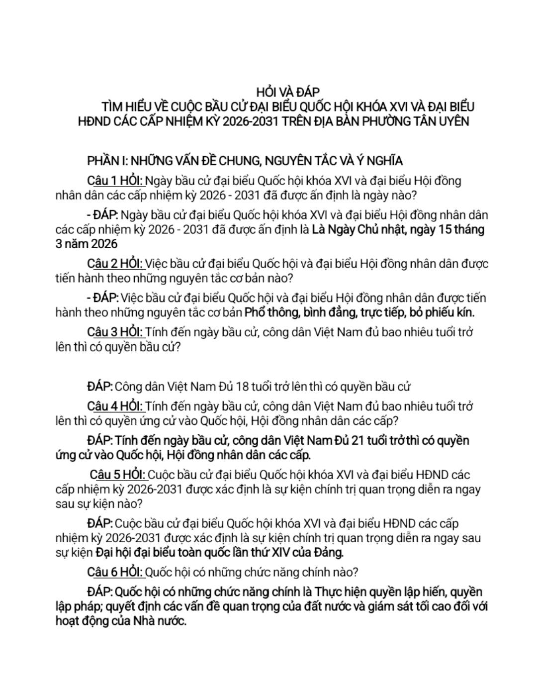 Ngày 28/12, Ban Thường trực Uỷ ban Mặt trận Tổ quốc Việt Nam phường Tân Uyên tổ chức Hội thi tìm hiểu pháp luật về bầu cử đại biểu Quốc hội khóa XVI và đại biểu Hội đồng nhân dân các cấp nhiệm kỳ 2026 - 2031 trên địa bàn phường Tân Uyên với chủ đề “Cử tri phường Tân Uyên sáng suốt lựa chọn - xây dựng chính quyền vững mạnh”.