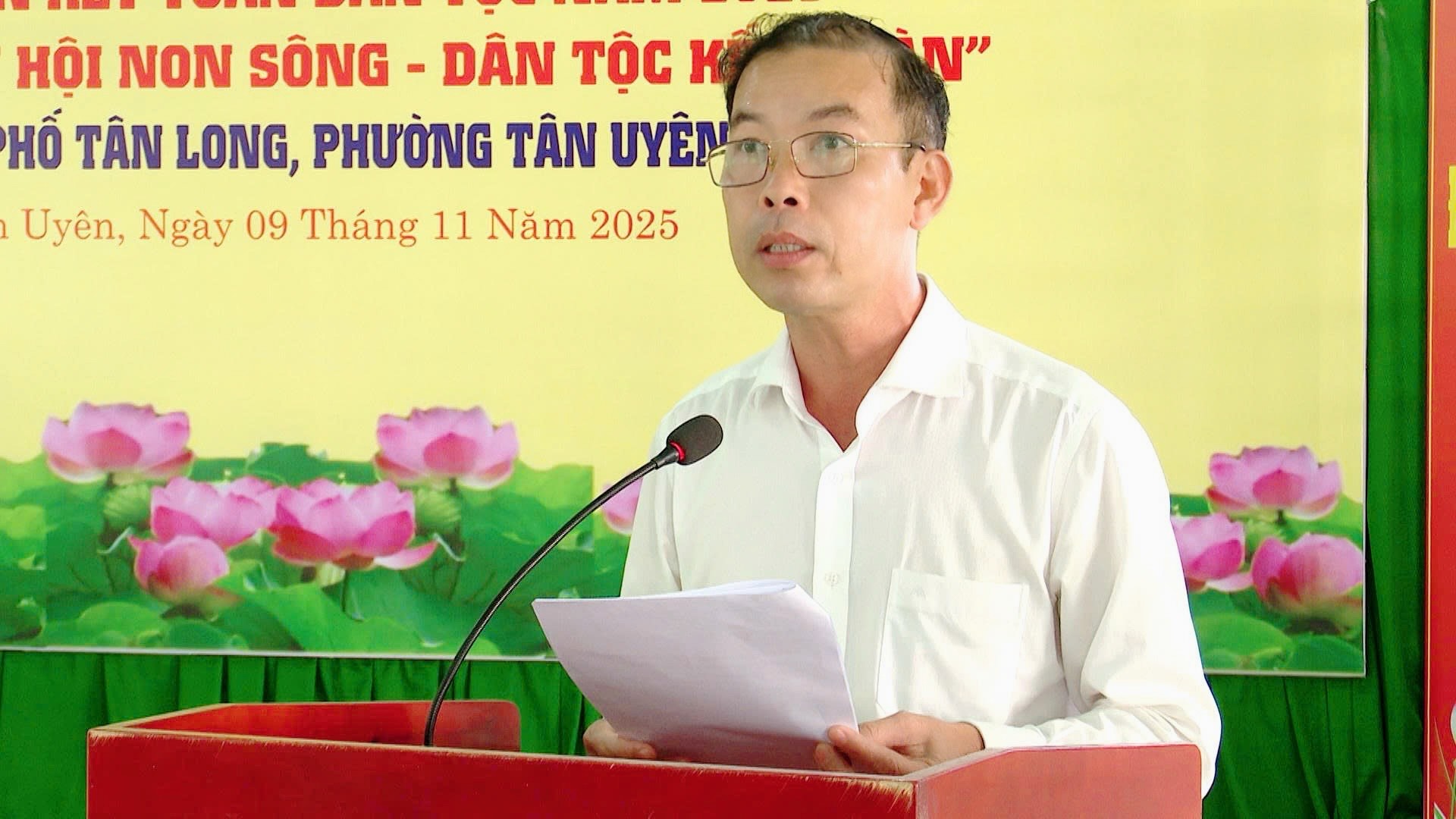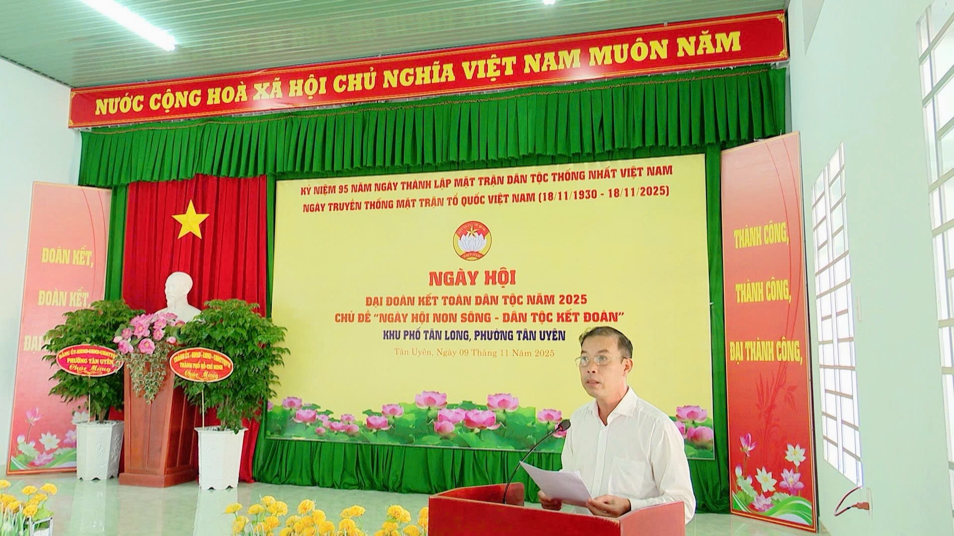 Phó Bí thư Thường trực Đảng uỷ phường bày tỏ niềm tin, phát huy truyền thống đoàn kết và tinh thần trách nhiệm, khu phố Tân Long sẽ tiếp tục là điểm sáng trong phong trào “Toàn dân đoàn kết xây dựng nông thôn mới, đô thị văn minh” của phường Tân Uyên. Hướng tới chào mừng Đại hội đại biểu toàn quốc lần thứ XIV của Đảng và Đại hội đại biểu Mặt trận Tổ quốc Việt Nam lần thứ XI, ông kêu gọi toàn thể cán bộ, đảng viên và Nhân dân khu phố Tân Long tiếp tục phát huy tinh thần đoàn kết, đổi mới, sáng tạo; tích cực hưởng ứng các phong trào thi đua yêu nước, thực hiện hiệu quả các cuộc vận động, góp phần xây dựng phường Tân Uyên ngày càng giàu đẹp, văn minh, hiện đại và nghĩa tình. Mỗi người dân hãy cùng nhau thực hiện những việc làm thiết thực trong đời sống hằng ngày giữ gìn môi trường, bảo đảm an ninh trật tự, trồng cây xanh, treo cờ Tổ quốc đúng quy định, chăm lo người nghèo, thực hiện đền ơn đáp nghĩa, xây dựng khu dân cư kiểu mẫu để mỗi con đường, mỗi ngôi nhà, mỗi nụ cười nơi đây đều toát lên niềm tự hào về tinh thần đại đoàn kết toàn dân.