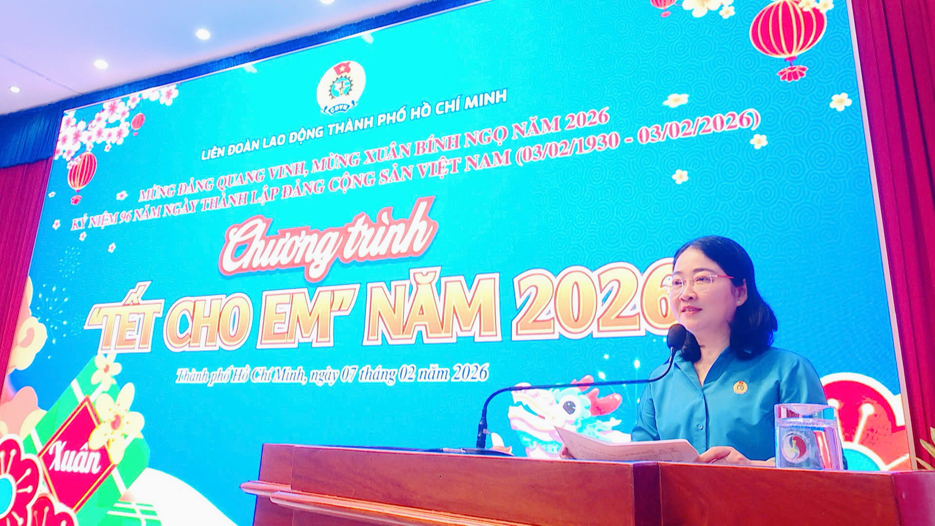Trong không khí rộn ràng, ấm áp nghĩa tình của những ngày giáp Tết cổ truyền của dân tộc, Tết Bính Ngọ 2026, phát biểu tại Chương trình “Tết cho em”, bà Nguyễn Kim Loan, Thành ủy viên, Phó Chủ tịch LĐLĐ TP.Hồ Chí Minh cho biết: “Tết cho em” không chỉ là một chương trình trao quà, mà còn là tấm lòng, là sự sẻ chia, là thông điệp yêu thương của tổ chức Công đoàn Thành phố gửi đến các cháu. Những phần quà tuy giá trị vật chất không lớn, nhưng là tình cảm chân thành, là sự quan tâm sâu sắc của chính quyền Thành phố; của các nhà hảo tâm; các mạnh tường quân và tổ chức Công đoàn đối với thế hệ mầm non-tương lai của đất nước. Qua chương trình này, các cháu sẽ cảm nhận được một cái Tết đủ đầy hơn, ấm áp hơn, có thêm niềm vui, thêm động lực để bước vào năm mới với nụ cười rạng rỡ trên môi. Các cháu hãy luôn ngoan ngoãn, lễ phép, chăm chỉ học tập, biết yêu thương, giúp đỡ cha mẹ, thầy cô và bạn bè; không ngừng rèn luyện để trở thành con ngoan, trò giỏi, sau này trở thành những công dân có ích cho xã hội, góp phần xây dựng TP.Hồ Chí Minh văn minh, hiện đại, nghĩa tình.
