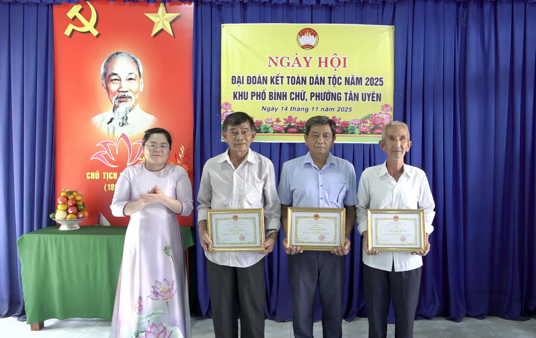 Cũng tại ngày hội, UBND phường đã trao tặng giấy khen cho 3 hộ gia đình tiêu biểu gắn với biểu dương gương người tốt việc tốt tại khu phố, và trao tặng quà cho 5 hộ gia đình khó khăn, nguồn quỹ được trích từ Quỹ Vì người nghèo phường Tân Uyên. Tiếp sau đó, Ban Công tác mặt trận khu phố phát động các nội dung thi đua và thực hiện ký kết Giao ước thi đua năm 2026, nhằm thực hiện tốt các nội dung trọng tâm cuộc vận động "Toàn dân đoàn kết xây dựng nông thôn mới, đô thị văn minh".