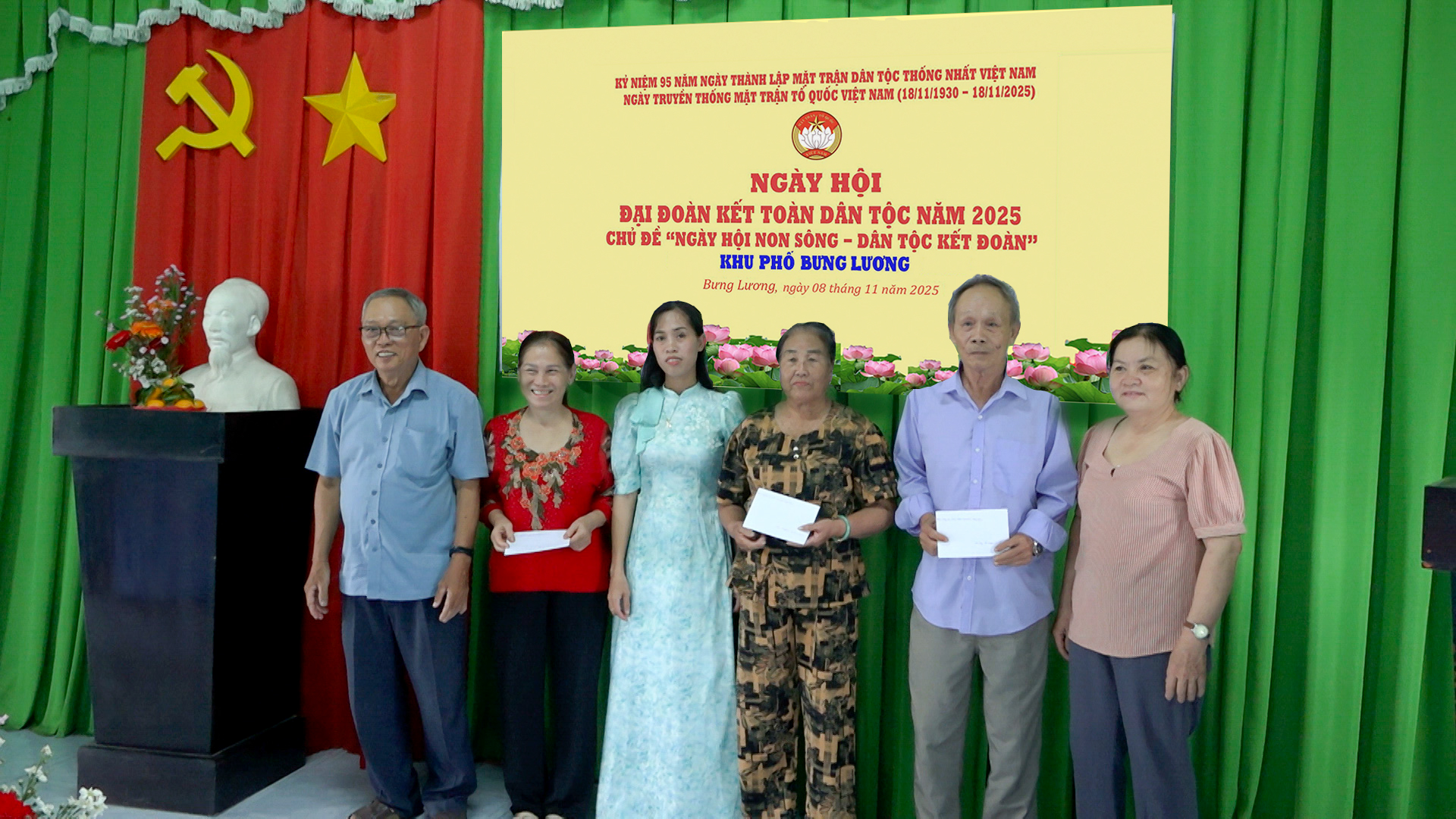 Tại ngày hội, các đại biểu, cán bộ và nhân dân khu phố Bưng Lương đã cùng nhau ôn lại truyền thống vẻ vang của MTTQ Việt Nam qua 95 năm xây dựng và trưởng thành, cũng như đánh giá kết quả xây dựng khối đại đoàn kết toàn dân tộc và kết quả thực hiện các cuộc vận động, các phong trào thi đua yêu nước trên địa bàn khu phố năm 2025.