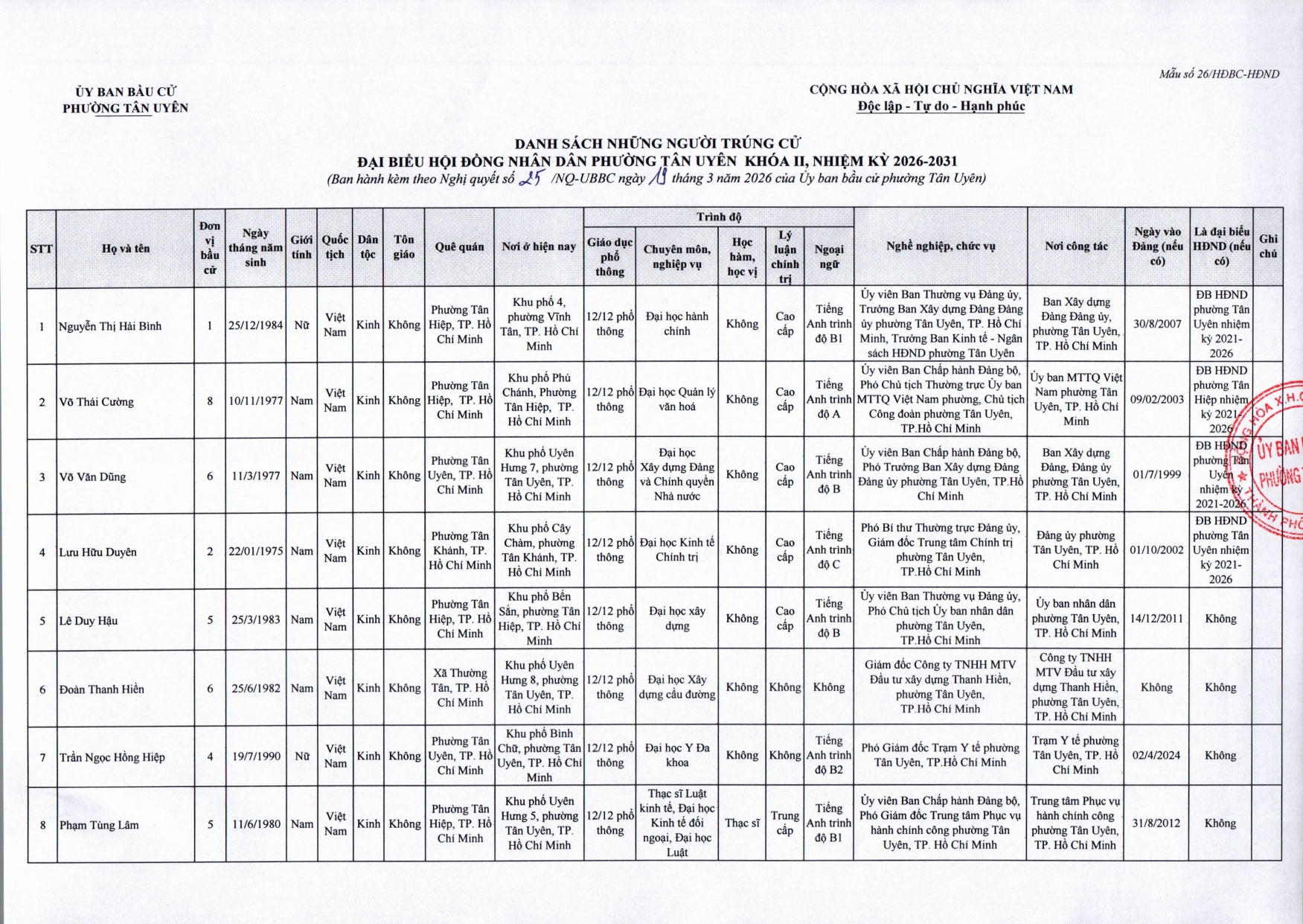 Chỉ còn thời gian rất ngắn nữa, cùng với cử tri cả nước, cử tri phường Tân Uyên sẽ tham gia bầu cử đại biểu Quốc hội khóa XVI và đại biểu Hội đồng nhân dân các cấp nhiệm kỳ 2026 - 2031. Những ngày này, khắp các tuyến đường, khu dân cư, khu nhà trọ, các cơ quan, doanh nghiệp trên địa bàn phường đều rộn ràng không khí hướng về ngày hội lớn của toàn dân. Cờ hoa, băng rôn, khẩu hiệu tuyên truyền được trang trí trang trọng, tạo nên sắc thắm rực rỡ, khí thế hân hoan. Người dân cùng nhau tìm hiểu tiểu sử, quá trình công tác và chương trình hành động của các ứng cử viên để lựa chọn những người tài đức. Không khí chuẩn bị cho ngày hội bầu cử đang lan tỏa khắp các khu dân cư.