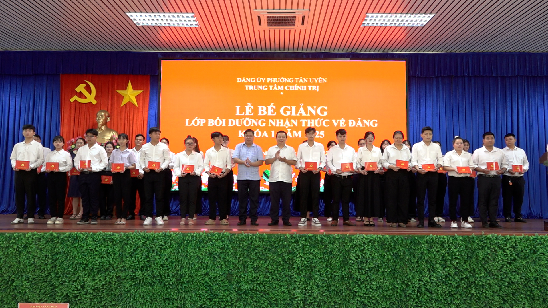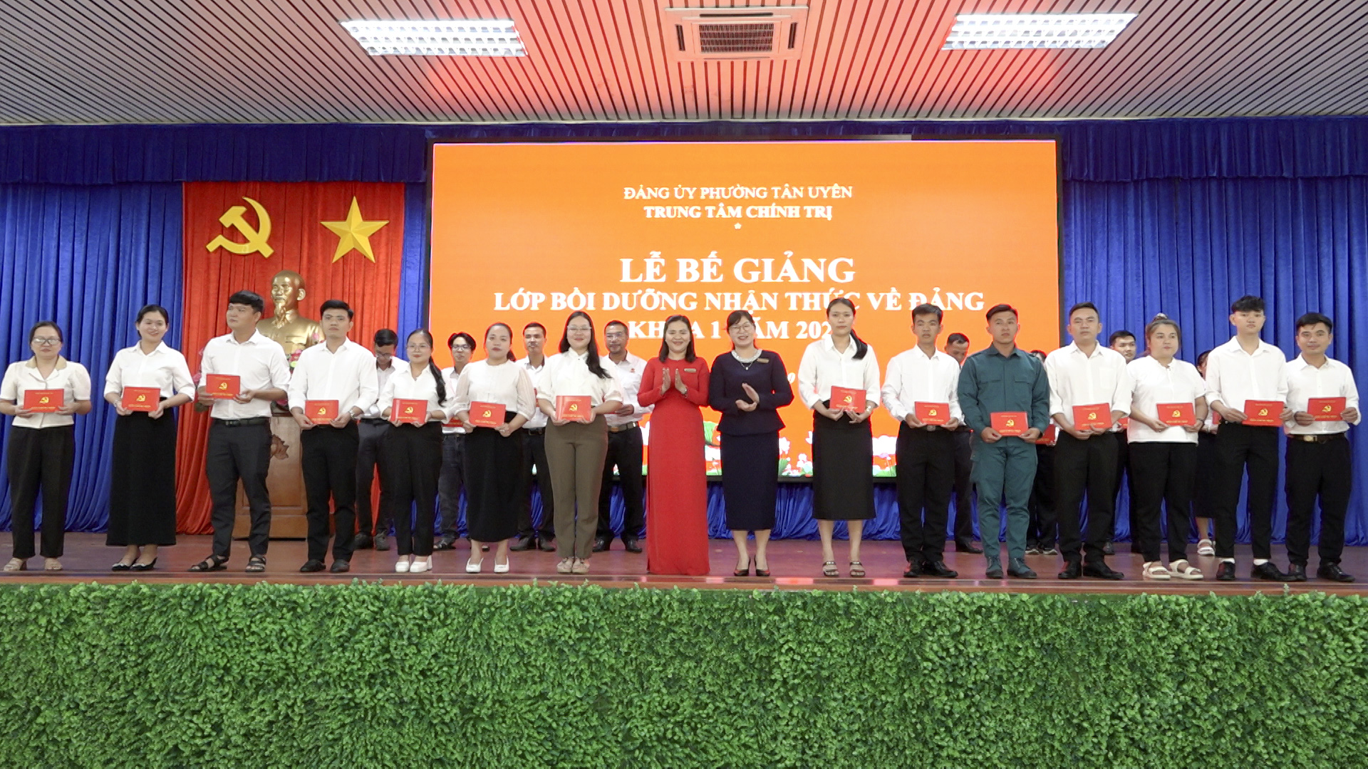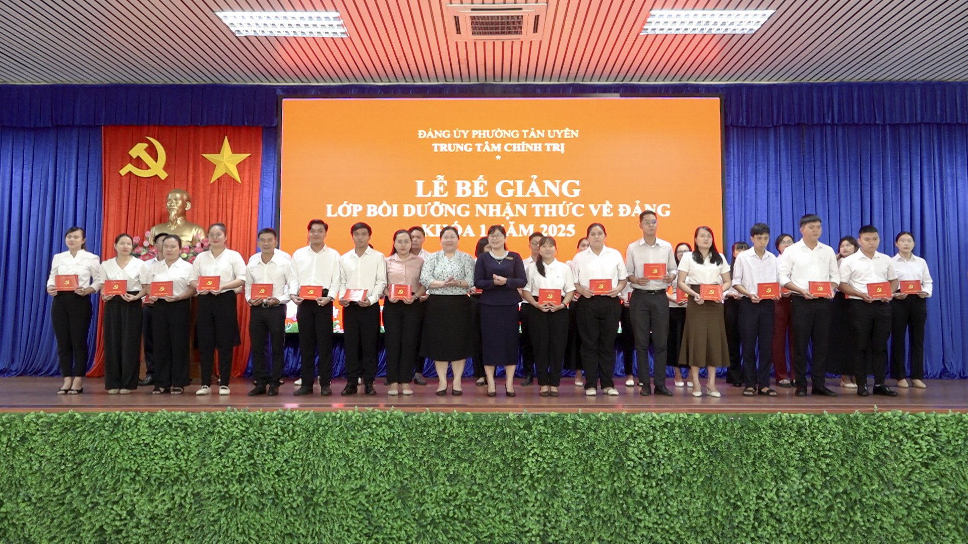 Lớp bồi dưỡng nhận thức về Đảng khoá 1 năm 2025 có 145 học viên là học sinh của các Trường THPT, cán bộ, viên chức, giáo viên, người lao động, công đoàn viên các cơ quan đơn vị, doanh nghiệp trên địa bàn phường Tân Uyên, Tân Hiệp, Tân Phước Khánh, Vĩnh Tân, Bình Cơ tham gia. Trải qua 05 ngày học tập, các học viên được nghiên cứu những nội dung: Khái lược lịch sử Đảng Cộng sản Việt Nam; Cương lĩnh xây dựng đất nước trong thời kỳ quá độ lên chủ nghĩa xã hội; Nội dung cơ bản của Điều lệ Đảng Cộng sản Việt Nam; Học tập và làm theo tư tưởng, đạo đức, phong cách Hồ Chí Minh; Phấn đấu trở thành đảng viên Đảng Cộng sản Việt Nam. Bên cạnh đó, lớp học cũng dành nhiều thời gian cho học viên trao đổi, thảo luận, tham quan thực tế và viết bài thu hoạch. Kết thúc khóa học, 145/145 học viên đã hoàn thành chương trình và được cấp giấy chứng nhận bồi dưỡng nhận thức về Đảng. Trong đó có 16 học viên đạt loại giỏi chiếm tỷ lệ 11% và 129 học viên đạt loại khá chiếm tỷ lệ 89%.