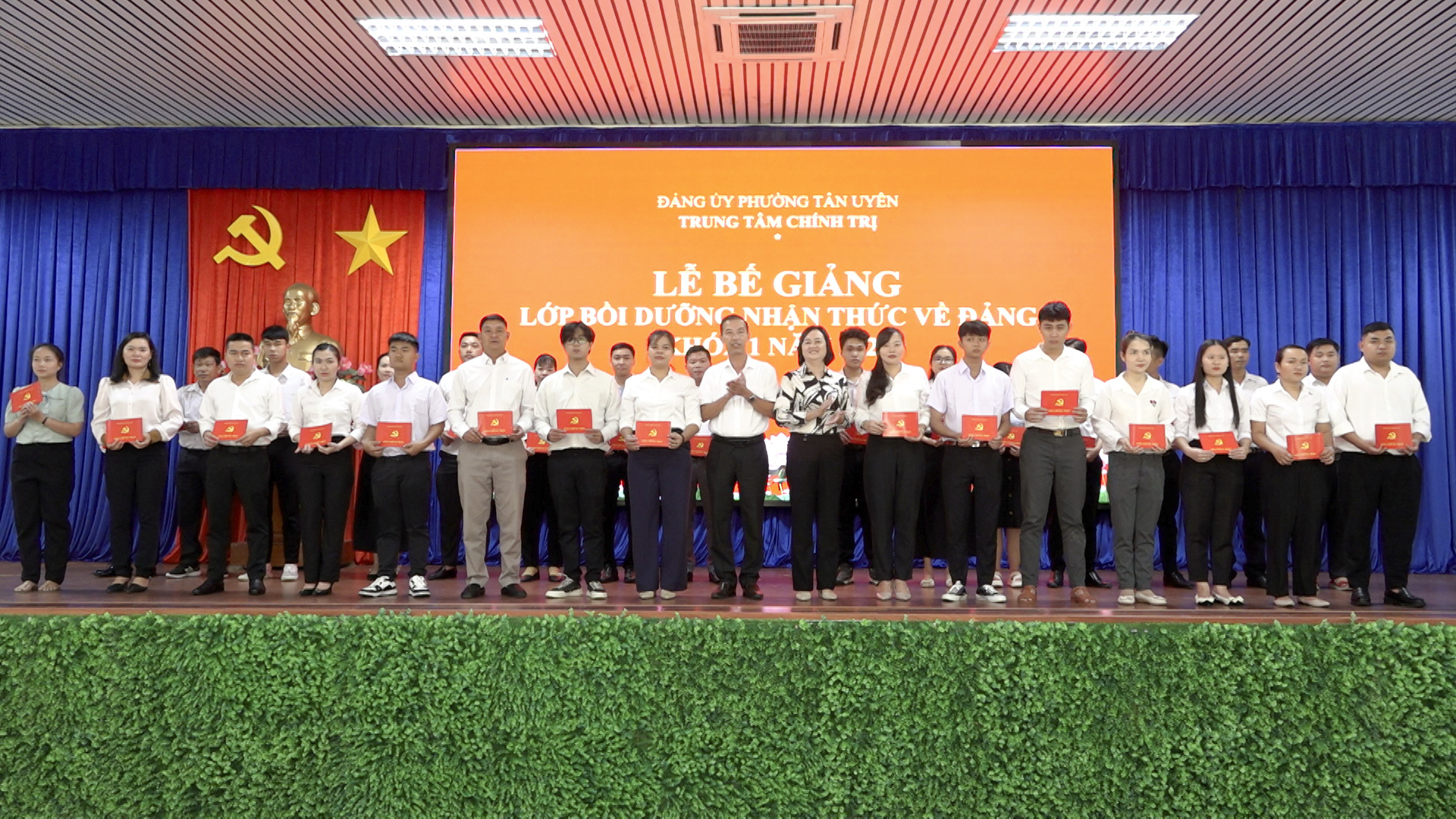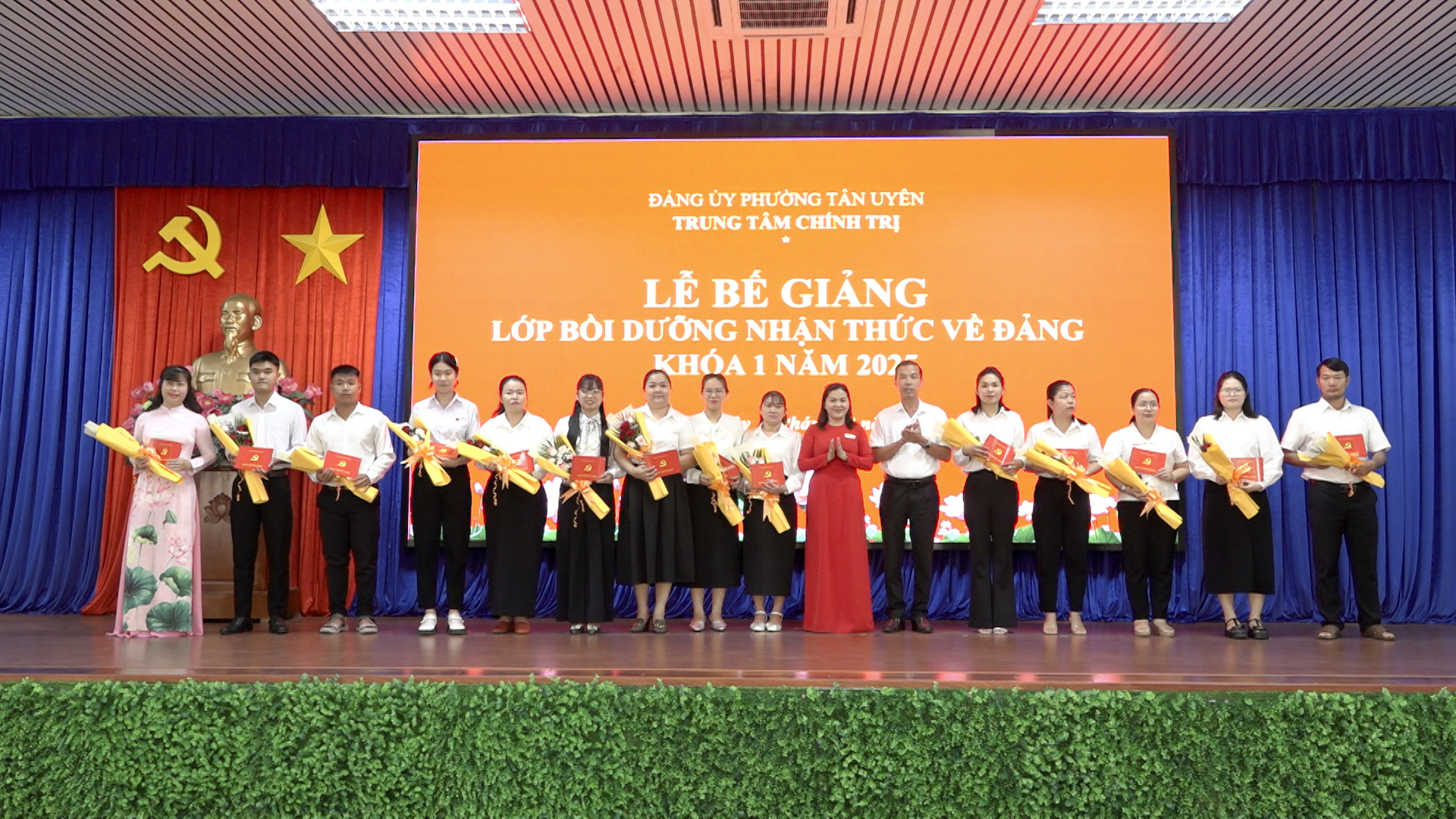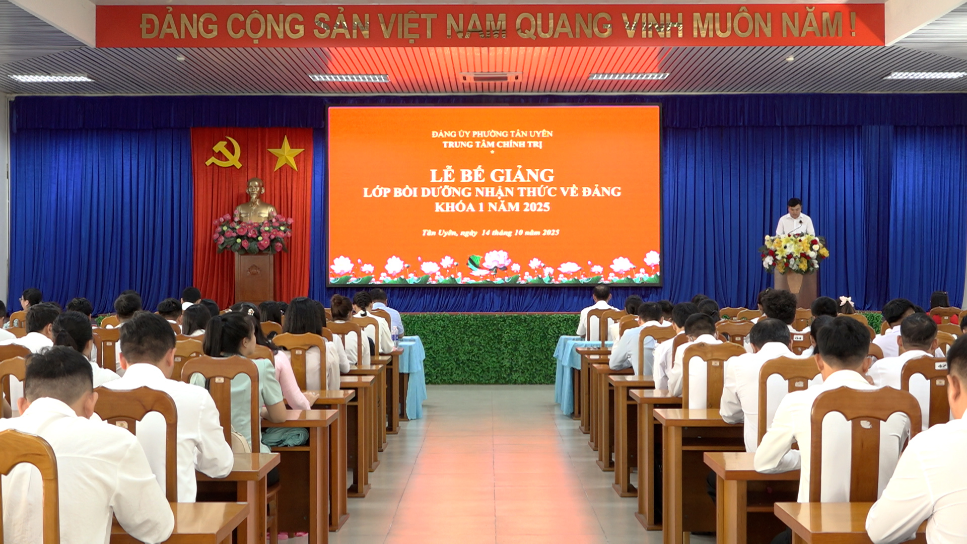 Lớp bồi dưỡng nhận thức về Đảng khoá 1 năm 2025 có 145 học viên là học sinh của các Trường THPT, cán bộ, viên chức, giáo viên, người lao động, công đoàn viên các cơ quan đơn vị, doanh nghiệp trên địa bàn phường Tân Uyên, Tân Hiệp, Tân Phước Khánh, Vĩnh Tân, Bình Cơ tham gia. Trải qua 05 ngày học tập, các học viên được nghiên cứu những nội dung: Khái lược lịch sử Đảng Cộng sản Việt Nam; Cương lĩnh xây dựng đất nước trong thời kỳ quá độ lên chủ nghĩa xã hội; Nội dung cơ bản của Điều lệ Đảng Cộng sản Việt Nam; Học tập và làm theo tư tưởng, đạo đức, phong cách Hồ Chí Minh; Phấn đấu trở thành đảng viên Đảng Cộng sản Việt Nam. Bên cạnh đó, lớp học cũng dành nhiều thời gian cho học viên trao đổi, thảo luận, tham quan thực tế và viết bài thu hoạch. Kết thúc khóa học, 145/145 học viên đã hoàn thành chương trình và được cấp giấy chứng nhận bồi dưỡng nhận thức về Đảng. Trong đó có 16 học viên đạt loại giỏi chiếm tỷ lệ 11% và 129 học viên đạt loại khá chiếm tỷ lệ 89%.