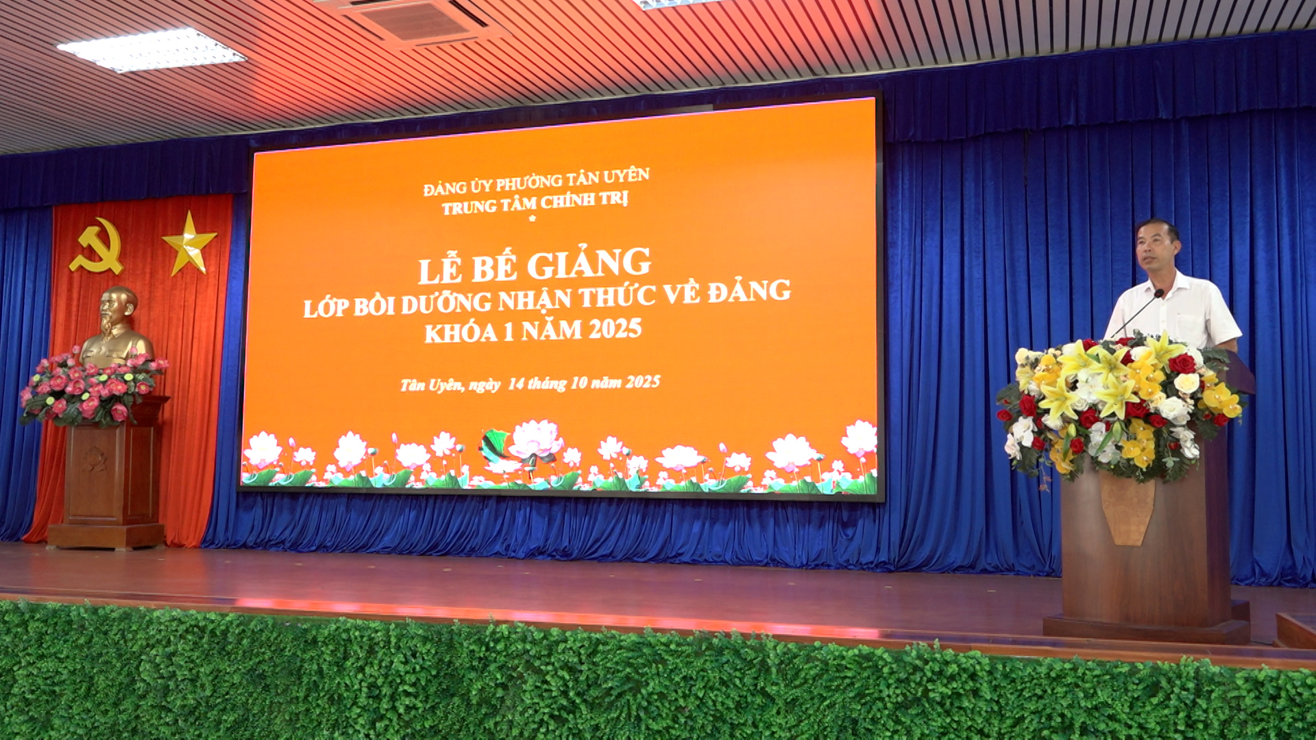 Sáng ngày14/10, Trung tâm Chính trị phường Tân Uyên tổ chức lễ bế giảng lớp bồi dưỡng nhận thức về Đảng khoá 1 năm 2025. Đến dự lễ bế giảng có đồng chí Lưu Hữu Duyên, Phó Bí thư Thường trực Đảng ủy, Giám đốc Trung tâm Chính trị phường, cùng các đồng chí đại diện lãnh đạo Đảng ủy phường Tân Uyên, Tân Hiệp, Tân Phước Khánh, Vĩnh Tân, Bình Cơ.
