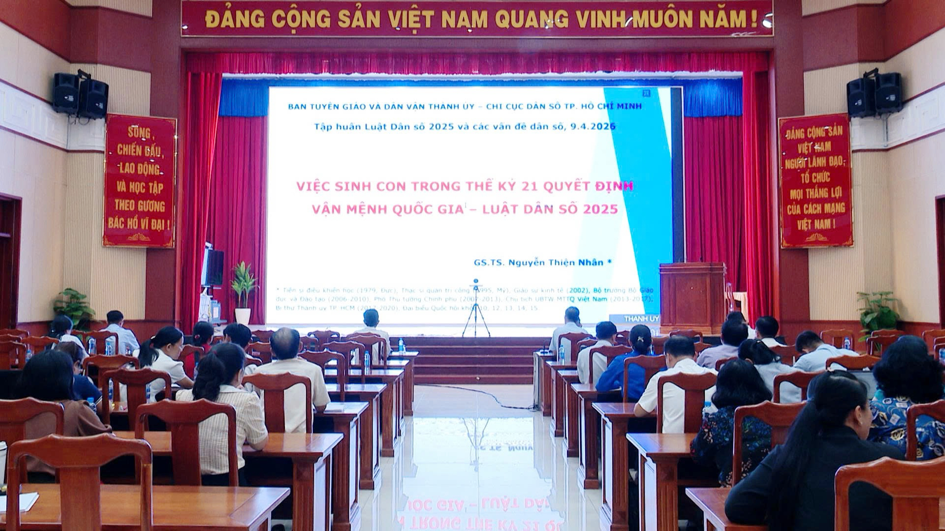 Tại hội nghị, các đại biểu đã nghe đồng chí Giáo sư, Tiến sĩ Nguyễn Thiện Nhân - Nguyên ủy viên Bộ Chính trị, Nguyên Bí thư Thành ủy Thành phố Hồ Chí Minh triển khai Chuyên đề: “Tuyên truyền về Luật Dân số và các vấn đề Dân số trên địa bàn Thành phố Hồ Chí Minh”. Bằng những số liệu thực tiễn, Giáo sư, Tiến sĩ Nguyễn Thiện Nhân đã phân tích sâu sắc về những điểm mới của Luật Dân số vừa được ban hành. Đồng chí nhấn mạnh, công tác dân số hiện nay không còn đơn thuần là “kế hoạch hóa gia đình” mà đã chuyển sang “dân số và phát triển”. Mục tiêu trọng tâm là duy trì mức sinh thay thế, đưa tỉ số giới tính khi sinh về mức cân bằng tự nhiên, tận dụng hiệu quả cơ cấu dân số vàng và thích ứng với quá trình già hóa dân số. Hiện nay, Thành phố Hồ Chí Minh đang có mức sinh rất thấp trong cả nước, năm 2024 tổng tỷ suất sinh chỉ đạt 1,43 con/phụ nữ so với mức 1,91 con của cả nước. Năm 2025, tổng tỷ suất sinh của Thành phố là 1,51 con/ phụ nữ có xu hướng tăng nhẹ so với năm 2024 (cả nước là 1,93 con/phụ nữ). Quan sát số liệu thống kê chuyên ngành Dân số, trong dãy số liệu ghi nhận từ năm 2000 đến năm 2025 cho thấy, tổng tỷ suất sinh của Thành phố duy trì xu hướng giảm, xuống rất thấp, điều này gây áp lực lớn đến nguồn nhân lực trong tương lai và tốc độ tăng trưởng kinh tế bền vững. Đồng chí lưu ý các báo cáo viên cần nắm vững các chính sách hỗ trợ của Thành phố dành cho các gia đình sinh đủ hai con, các chế độ phúc lợi về giáo dục, y tế để tuyên truyền sâu rộng đến nhân dân.