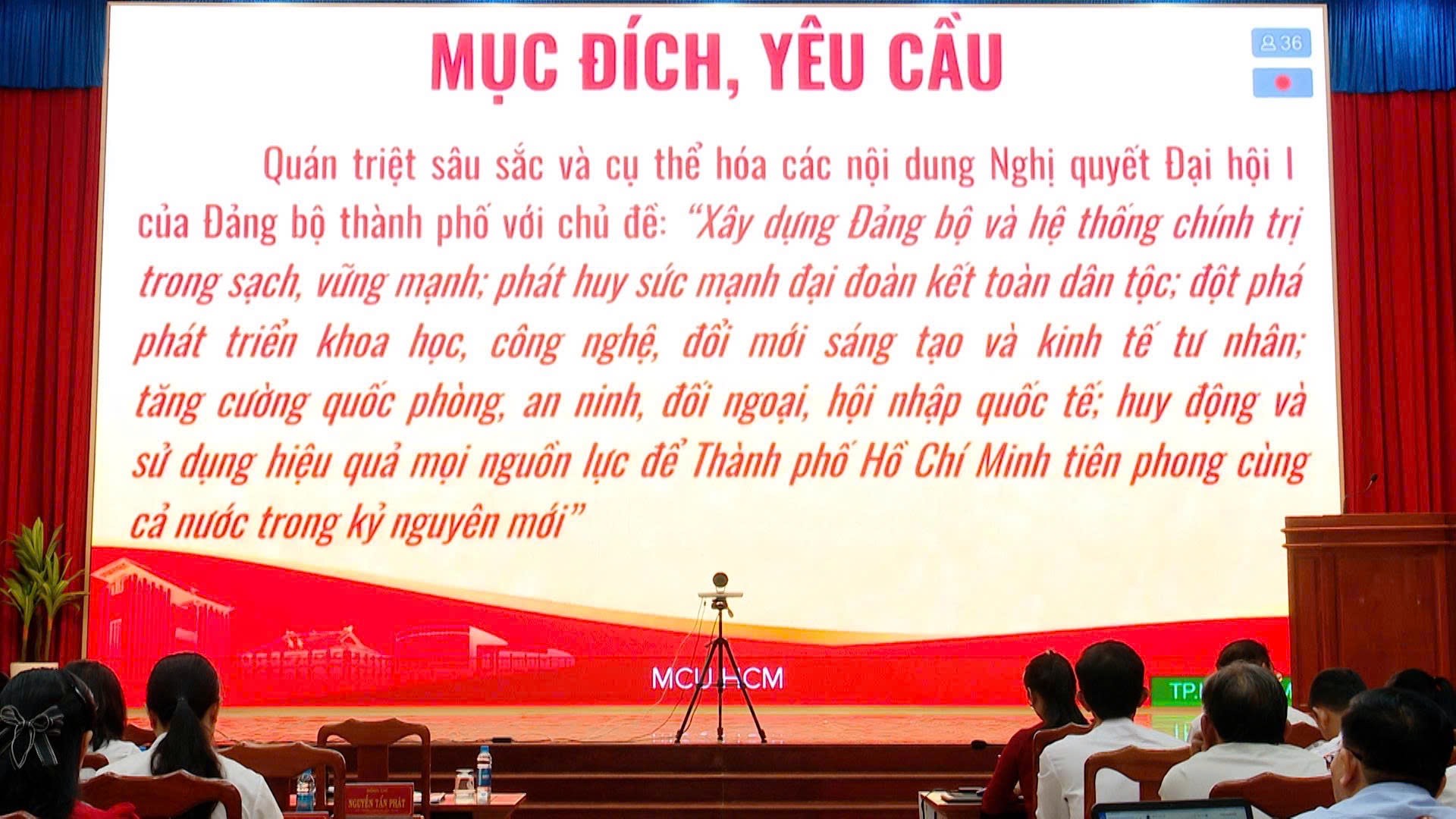 Tại hội nghị, các đại biểu được nghe đồng chí Lê Quốc Phong, Phó Bí thư Thường trực Thành ủy TP.HCM đã quán triệt Nghị quyết Đại hội Đảng bộ TP.HCM lần thứ I, nhiệm kỳ 2025-2030; đồng chí Đặng Minh Thông, Phó Bí thư Thành ủy TP.HCM triển khai Chương trình hành động thực hiện Nghị quyết Đại hội Đảng bộ TP.HCM lần thứ I, nhiệm kỳ 2025 - 2030.