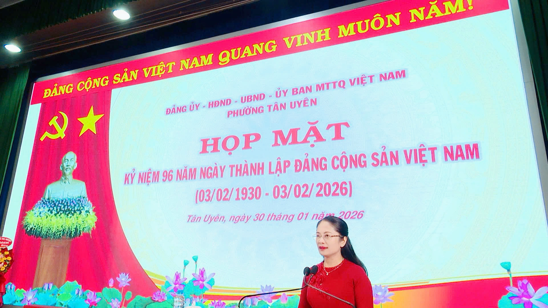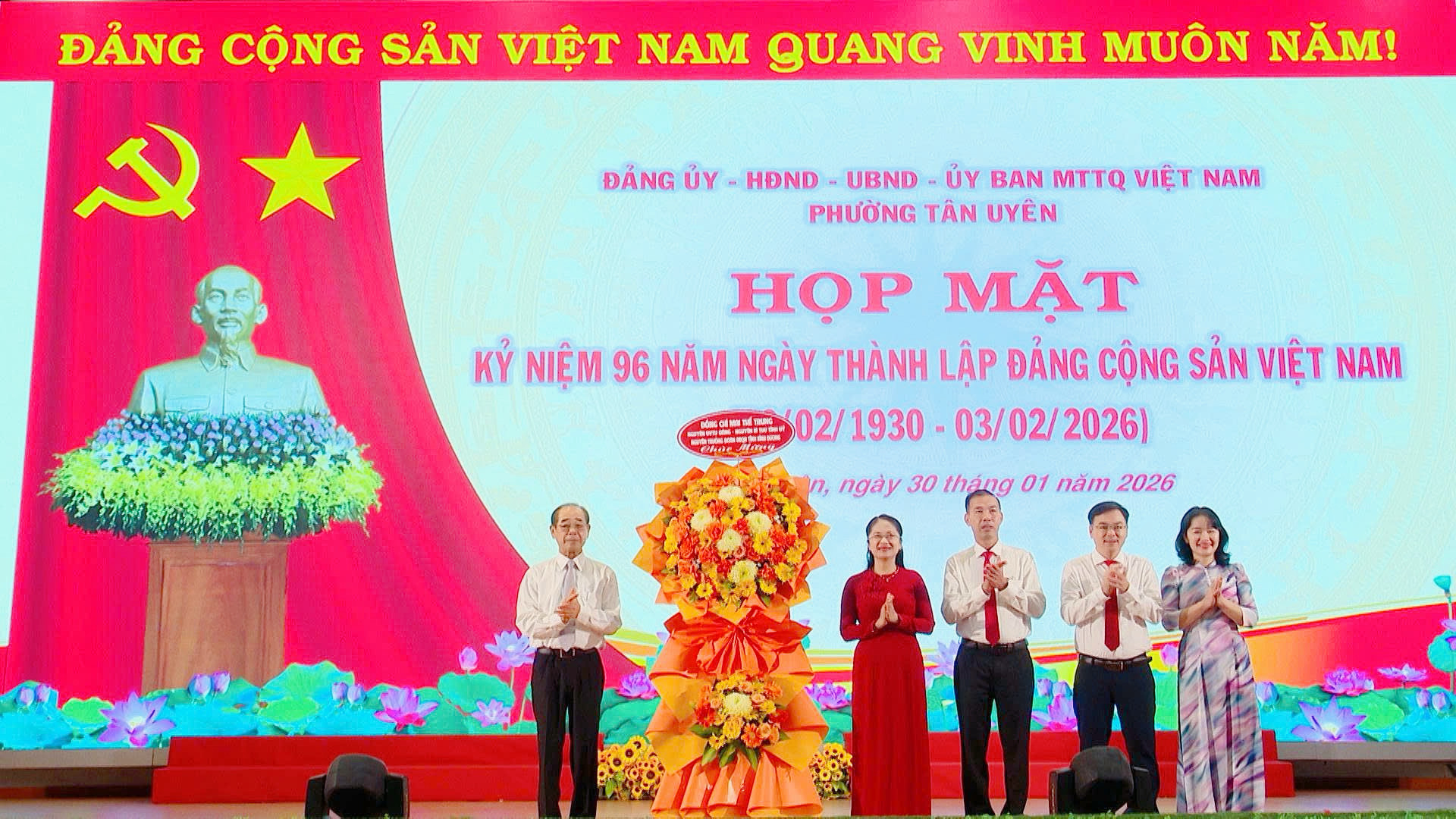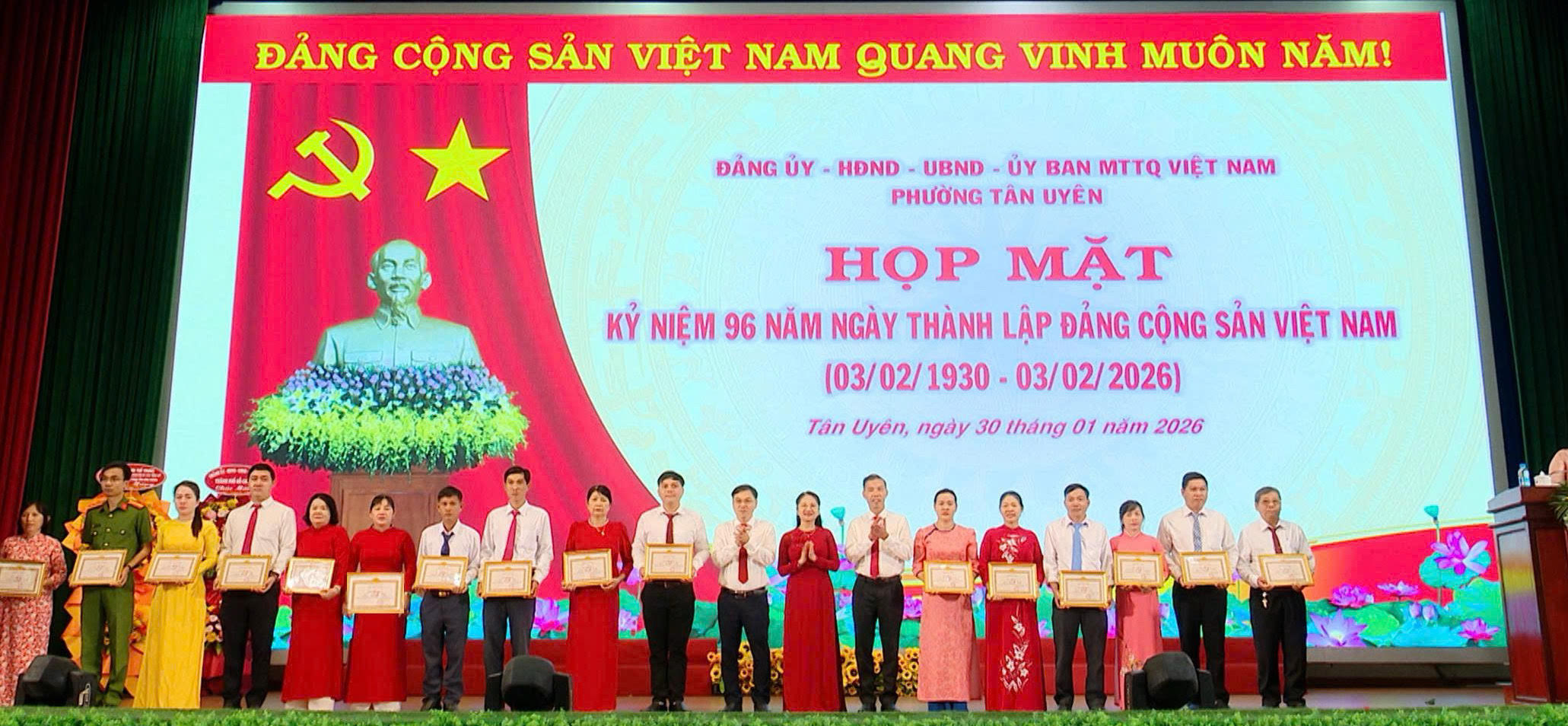 Hòa trong không khí vui tươi, phấn khởi mừng Đảng, mừng Xuân Bính Ngọ, sáng ngày 30/01, Đảng ủy - Hội đồng nhân dân - Uỷ ban nhân dân - Uỷ ban Mặt trận Tổ quốc Việt Nam phường Tân Uyên long trọng tổ chức Họp mặt Kỷ niệm 96 năm Ngày thành lập Đảng Cộng sản Việt Nam (03/02/1930 - 03/02/2026).
