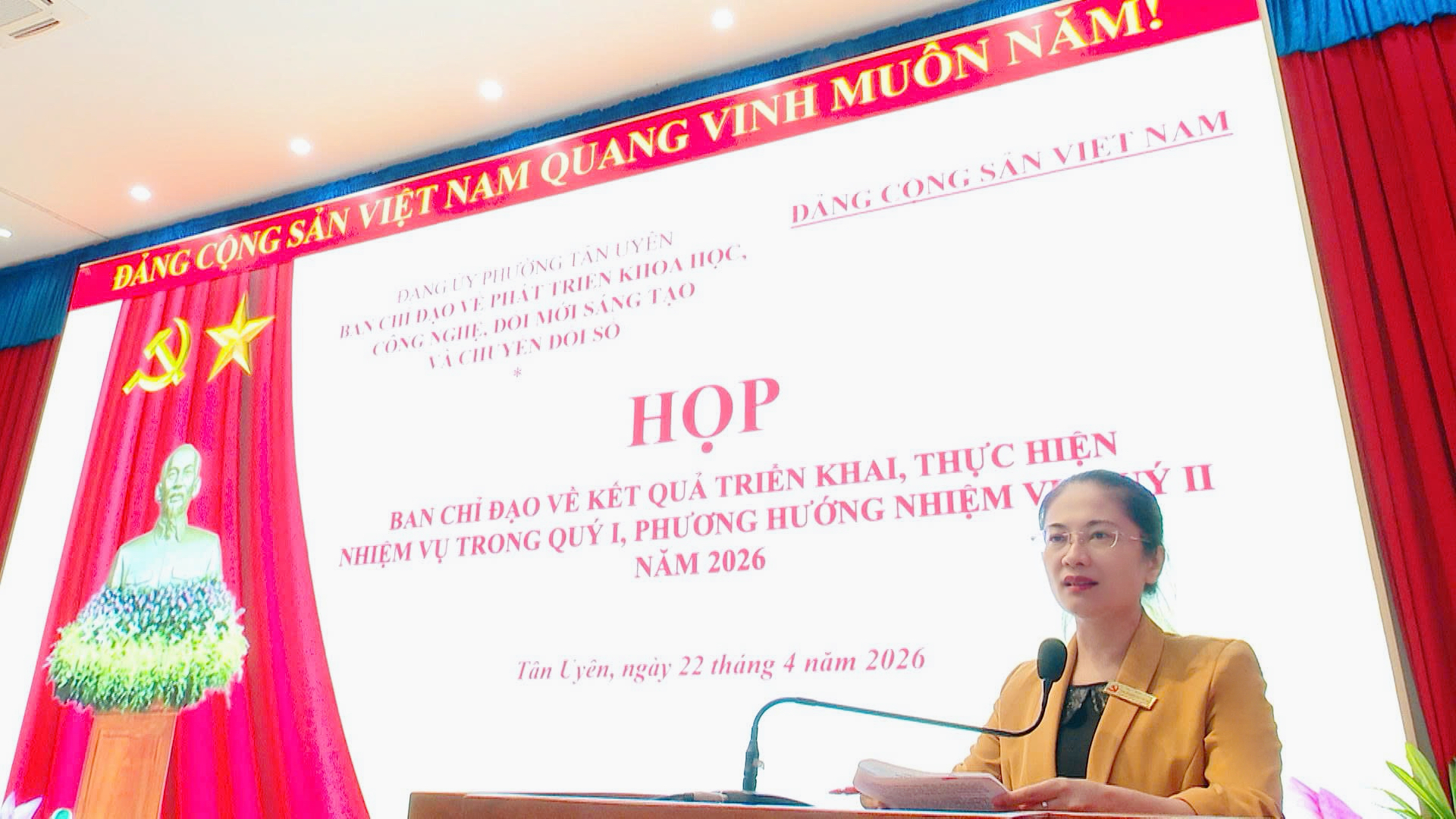 Chiều 22/4, Ban Chỉ đạo về phát triển khoa học, công nghệ, đổi mới sáng tạo và chuyển đổi số phường Tân Uyên tổ chức họp đánh giá kết quả triển khai, thực hiện nhiệm vụ trong quý I, đề ra phương hướng, nhiệm vụ quý II năm 2026. Đồng chí Nguyễn Thị Tuyết Nhung - Bí thư Đảng uỷ, Chủ tịch Hội đồng nhân dân phường, Trưởng ban chỉ đạo chủ trì cuộc họp.