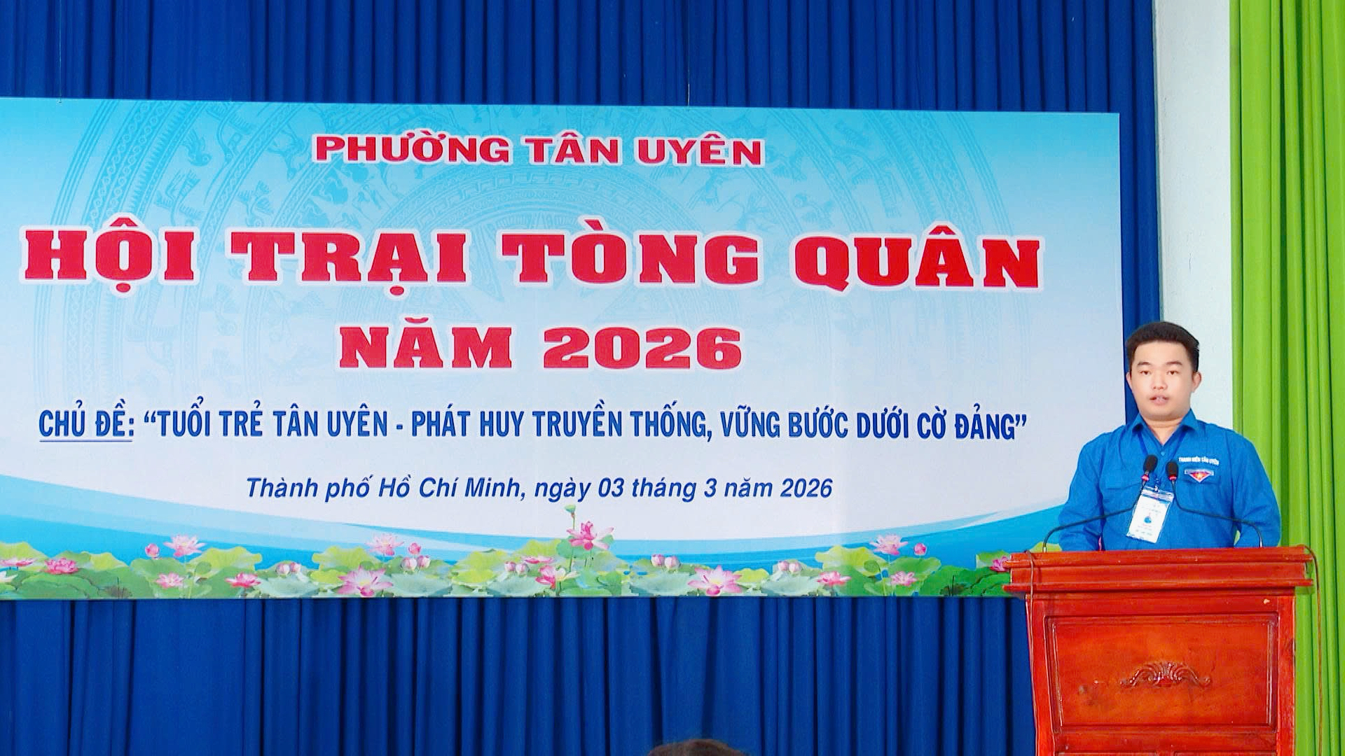 Phát biểu khai mạc hội trại, đồng chí Nguyễn Tấn Lập, Phó Bí thư Đảng uỷ, Chủ tịch UBND, Chủ tịch Hội đồng nghĩa vụ quân sự phường cho biết, Hội trại Tòng quân không chỉ là hoạt động văn hóa - chính trị thường niên, mà còn là môi trường giáo dục truyền thống, hun đúc lý tưởng cách mạng và khơi dậy niềm tự hào trong mỗi thanh niên trước giờ phút lên đường. Chủ đề "Tuổi trẻ Tân Uyên - Phát huy truyền thống, vững bước dưới cờ Đảng" thể hiện quyết tâm của tuổi trẻ Tân Uyên trong việc tiếp nối truyền thống anh hùng, biến tinh thần yêu nước thành hành động cụ thể. Đồng chí yêu cầu các trại sinh phát huy tinh thần đoàn kết, năng động, nhiệt tình; chấp hành nghiêm nội quy; tích cực tham gia các hoạt động. Ban Chỉ huy các tiểu trại cần nêu cao tinh thần trách nhiệm, tổ chức tốt các nội dung chương trình đã đề ra để Hội trại thực sự trở thành ngày hội ý nghĩa của tuổi trẻ Tân Uyên. Đối với các thanh niên trúng tuyển nghĩa vụ quân sự, nghĩa vụ Công an nhân dân luôn giữ vững bản lĩnh chính trị; tuyệt đối chấp hành kỷ luật; tích cực học tập, rèn luyện; đoàn kết, giúp đỡ đồng chí, đồng đội; quyết tâm hoàn thành tốt mọi nhiệm vụ được giao. Môi trường quân ngũ sẽ là trường học lớn, giúp các đồng chí trưởng thành toàn diện về ý chí, tác phong và trách nhiệm công dân. Đề nghị các ban, ngành, đoàn thể phường tiếp tục quan tâm thực hiện tốt chính sách hậu phương quân đội; kịp thời động viên, hỗ trợ gia đình các thanh niên trúng tuyển để các đồng chí yên tâm lên đường thực hiện nhiệm vụ.