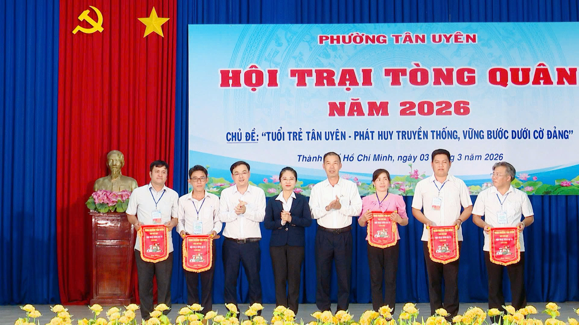 Để ghi nhận sự tham gia của các đơn vị trong Hội trại Tòng quân năm 2026, Ban chỉ đạo Hội trại Tòng quân phường Tân Uyên năm 2026 đã tặng cờ lưu niệm cho các đơn vị tham gia hội trại.