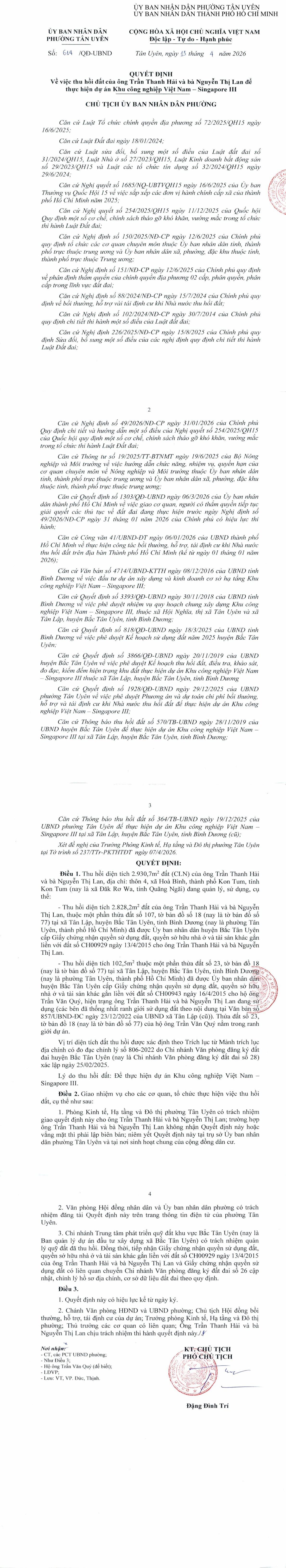 Quyết định về việc thu hồi đất của ông Trần Thanh Hải và bà Nguyễn Thị Lan để thực hiện dự án Khu công nghiệp Việt nam - Singapore III