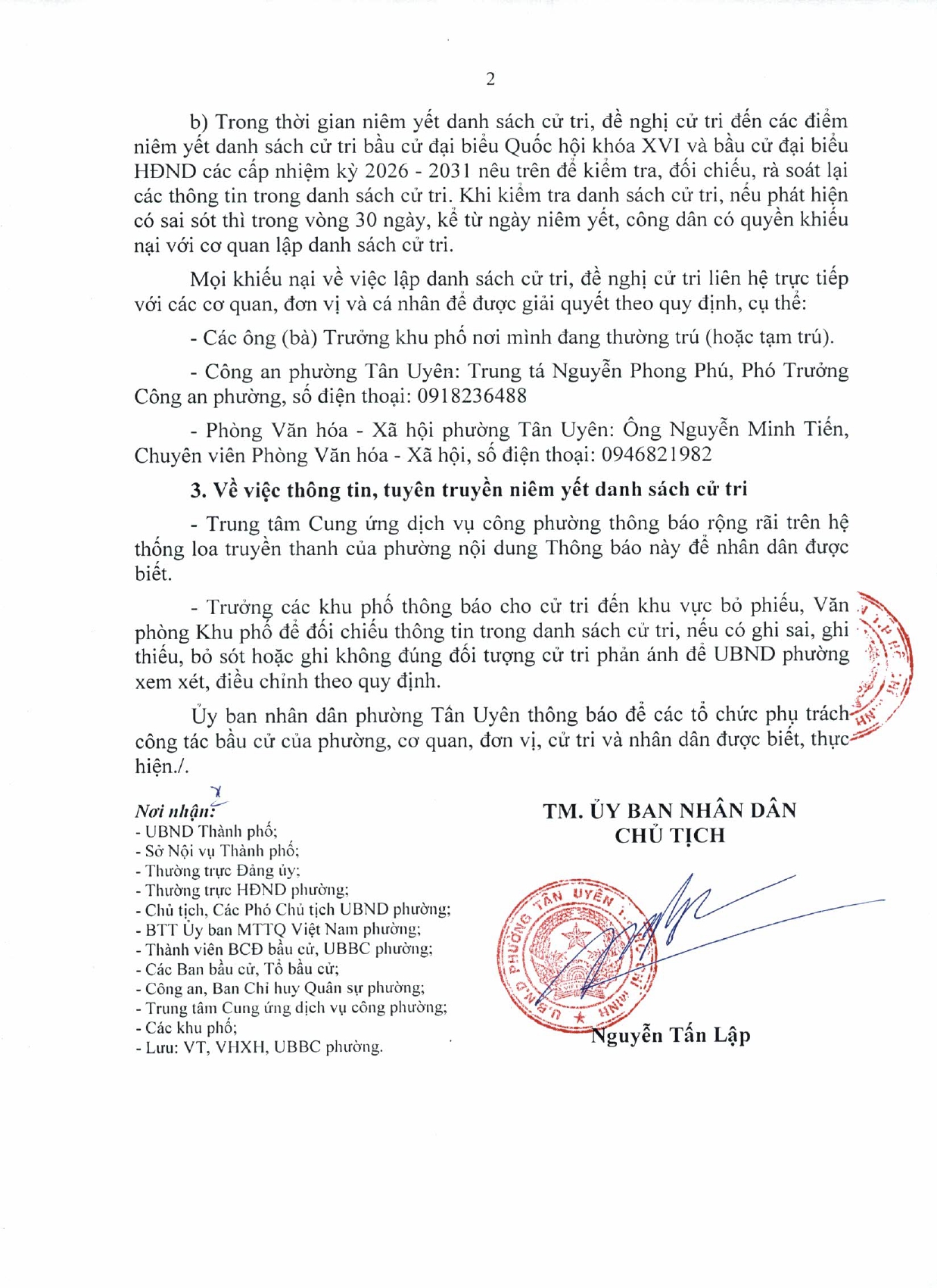 Thông báo về việc niêm yết danh sách cử tri bầu cử đại biểu Quốc hội khóa XVI và đại biểu Hội đồng nhân dân các cấp nhiệm kỳ 2026-2031