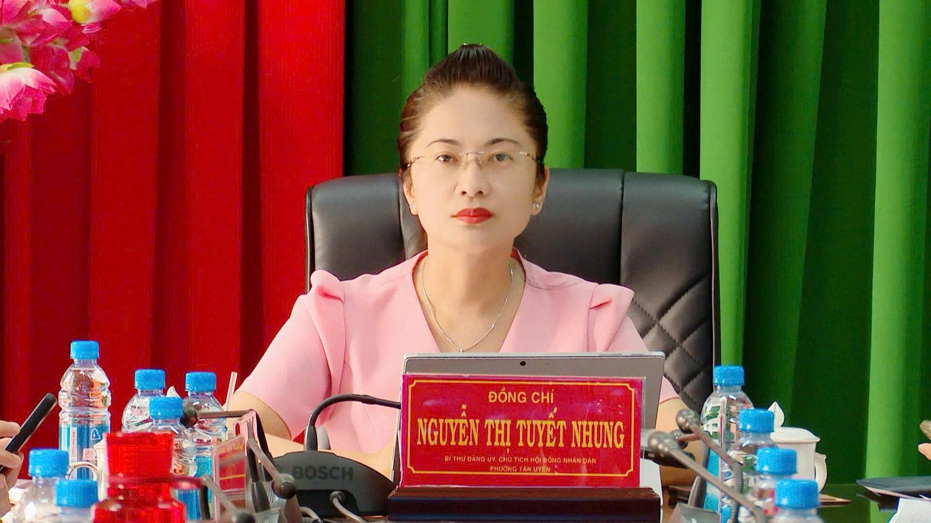 Tại phòng họp trực tuyến phường Tân Uyên, dự họp có đồng chí Nguyễn Thị Tuyết Nhung - Bí thư Đảng ủy, Chủ tịch Hội đồng nhân dân phường, đồng chí Lưu Hữu Duyên - Phó Bí thư Thường trực Đảng ủy, Giám đốc Trung tâm Chính trị phường, đồng chí Nguyễn Tấn Lập - Phó Bí thư Đảng ủy, Chủ tịch Ủy ban nhân dân phường cùng các đồng chí thành viên Ban Chỉ đạo bầu cử phường.