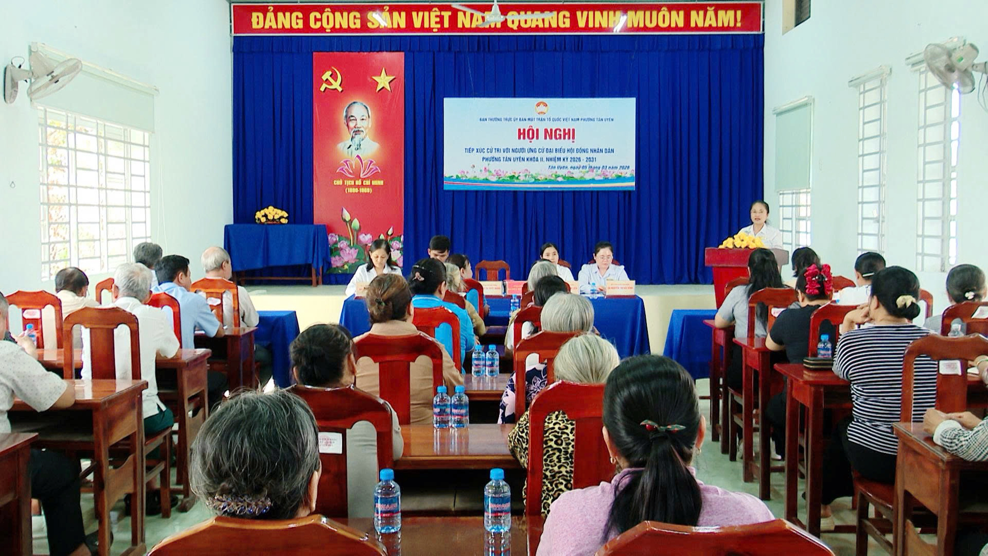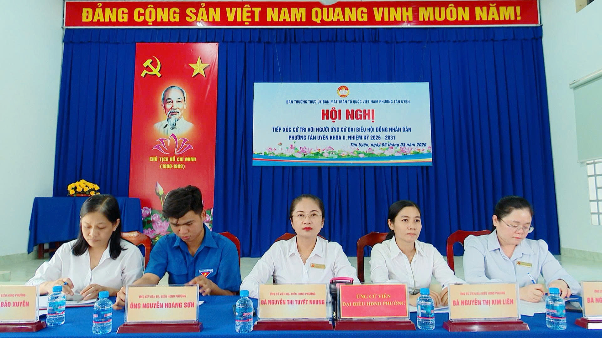 Đơn vị bầu cử số 1 gồm khu phố Bình Hưng, Tân Trạch, Điều Hòa, Bình Chữ, An Chữ, Tân Long có 5 người ứng cử đại biểu Hội đồng nhân dân phường khóa II, nhiệm kỳ 2026 - 2031 gồm: bà Nguyễn Thị Tuyết Nhung - Bí thư Đảng ủy, Chủ tịch Hội đồng nhân dân phường Tân Uyên, Đại biểu HĐND thành phố khóa X, nhiệm kỳ 2021 - 2026, Thành viên Ban Pháp chế Hội đồng nhân dân Thành phố Hồ Chí Minh; bà Nguyễn Thị Hải Bình - Ủy viên Ban Thường vụ Đảng ủy, Trưởng ban Xây dựng Đảng Đảng ủy phường Tân Uyên; bà Võ Thị Bảo Xuyên - Cán bộ, Ủy viên Ban Chấp hành Đảng bộ, Trưởng phòng Văn hóa - Xã hội phường Tân Uyên, Nguyên Phó Chủ nhiệm Ủy ban Kiểm tra Đảng ủy phường; bà Nguyễn Thị Kim Liên - Người hoạt động không chuyên trách, Chủ tịch Hội Chữ thập đỏ phường Tân Uyên; ông Nguyễn Hoàng Sơn - Người hoạt động không chuyên trách, Phó Bí thư Đoàn Thanh niên Cộng sản Hồ Chí Minh phường Tân Uyên. Bà Nguyễn Ngọc Mai - Uỷ ban Ban Thường vụ Đảng ủy, Chủ tịch Ủy ban Mặt trận Tổ quốc Việt Nam phường chủ trì hội nghị.