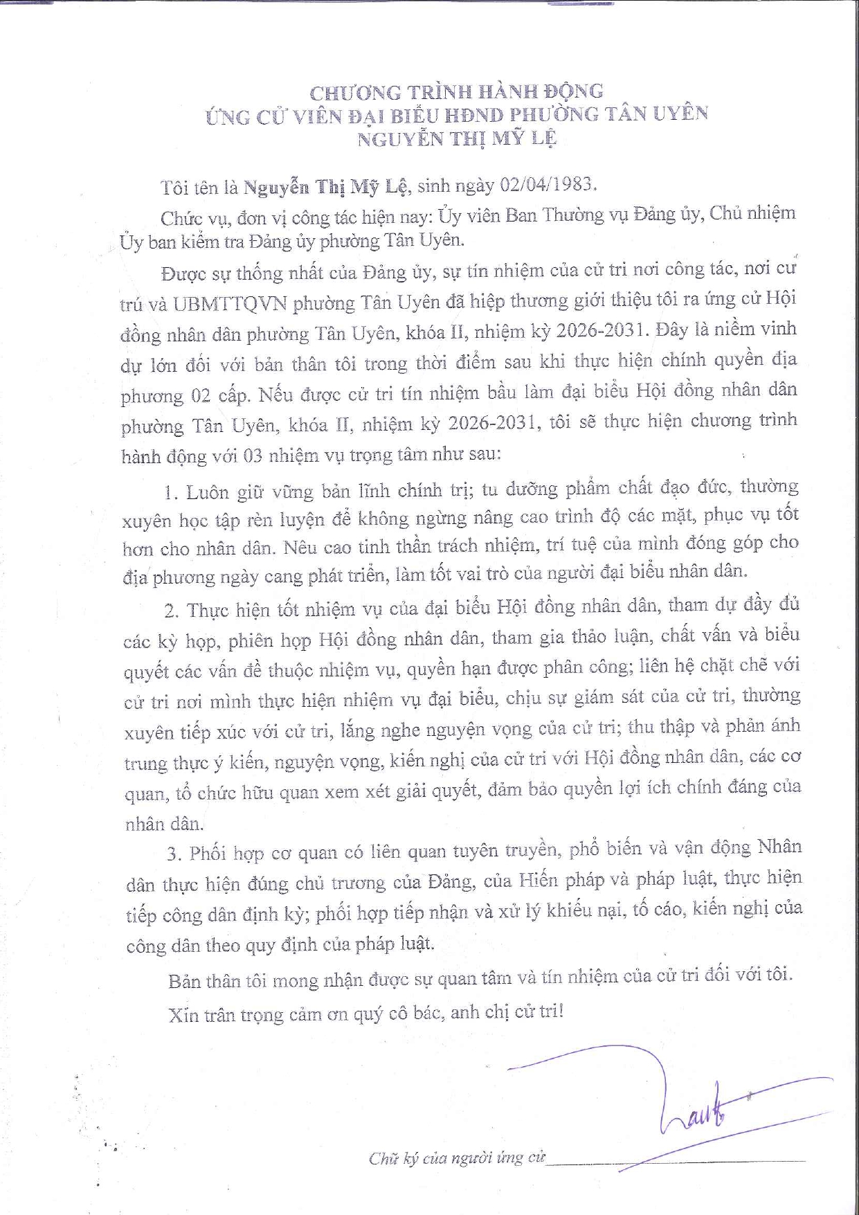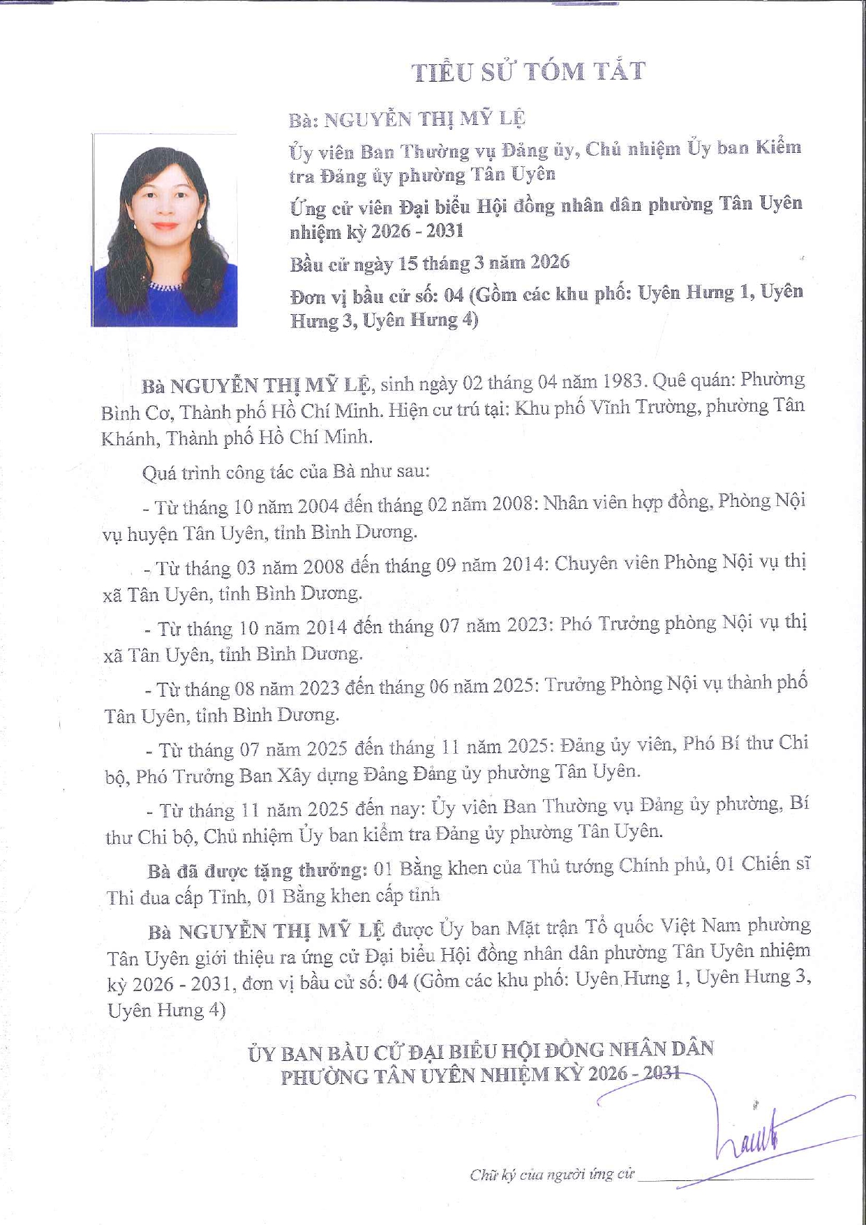 Tiểu sử tóm tắt và Chương trình hành động của bà Nguyễn Thị Mỹ Lệ ứng cử viên Đại biểu hội đồng nhân dân phường Tân Uyên khóa II, nhiệm kỳ 2026 – 2031