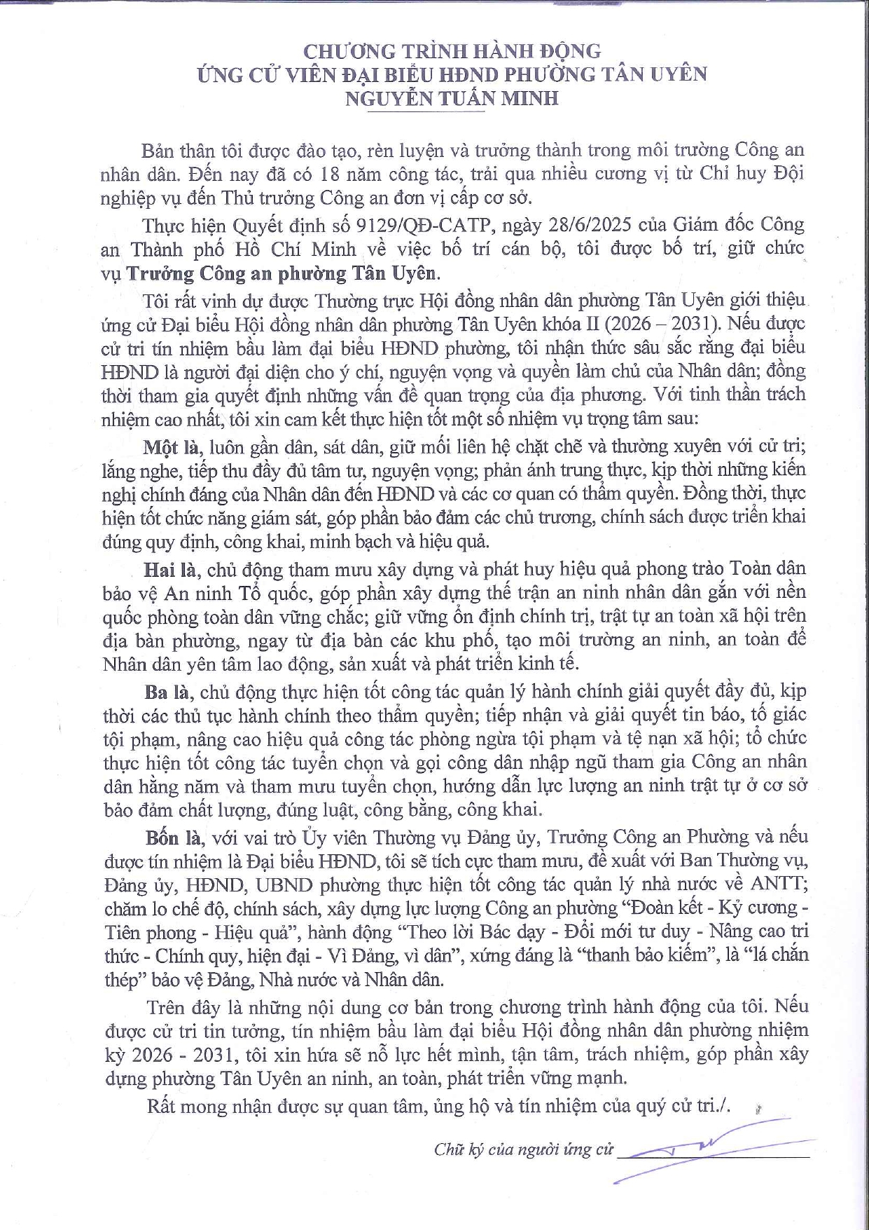 Tiểu sử tóm tắt và Chương trình hành động của ông Đoàn Phương Tùng ứng cử viên Đại biểu hội đồng nhân dân phường Tân Uyên khóa II, nhiệm kỳ 2026 – 2031. Đơn vị bầu cử số 07 gồm tổ 1, 2, 3, 4, 6 - khu phố Uyên Hưng 7