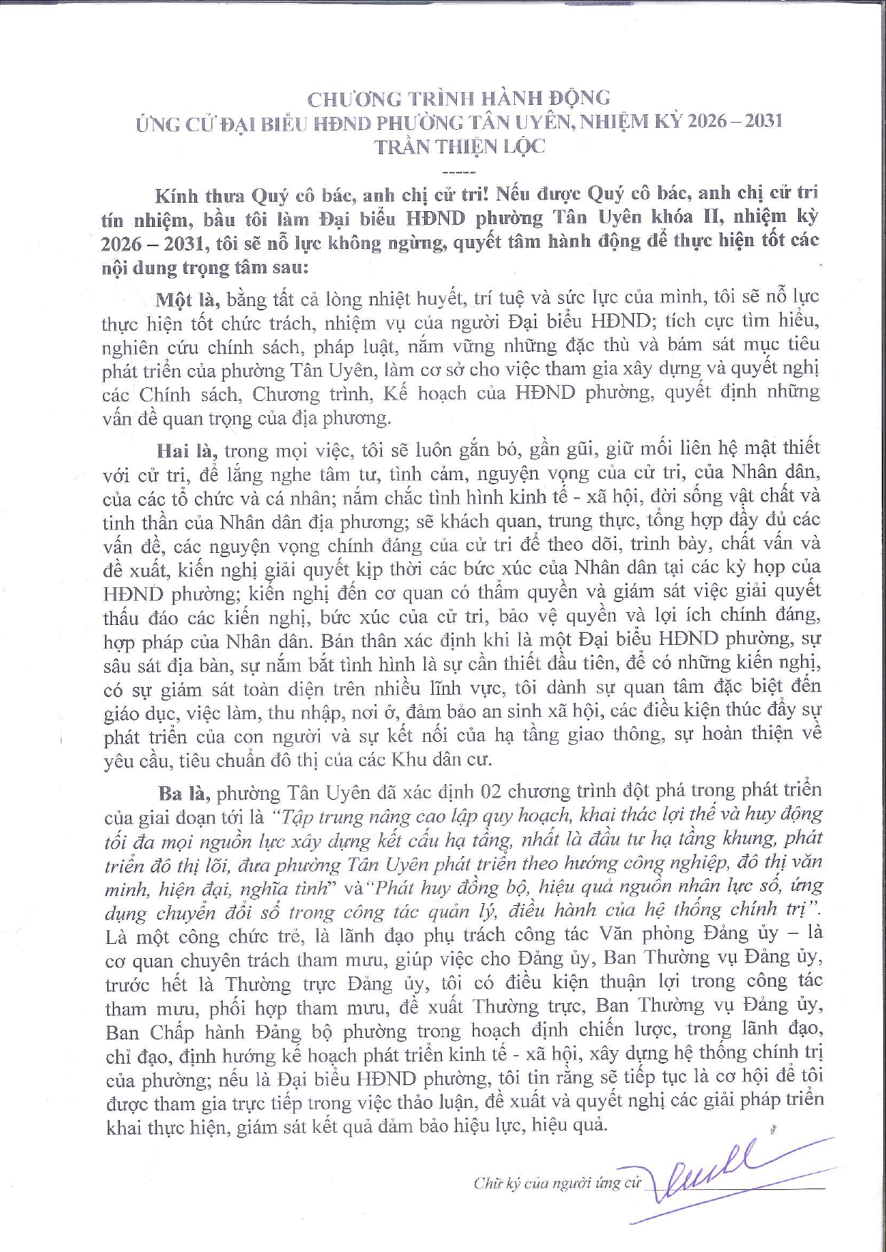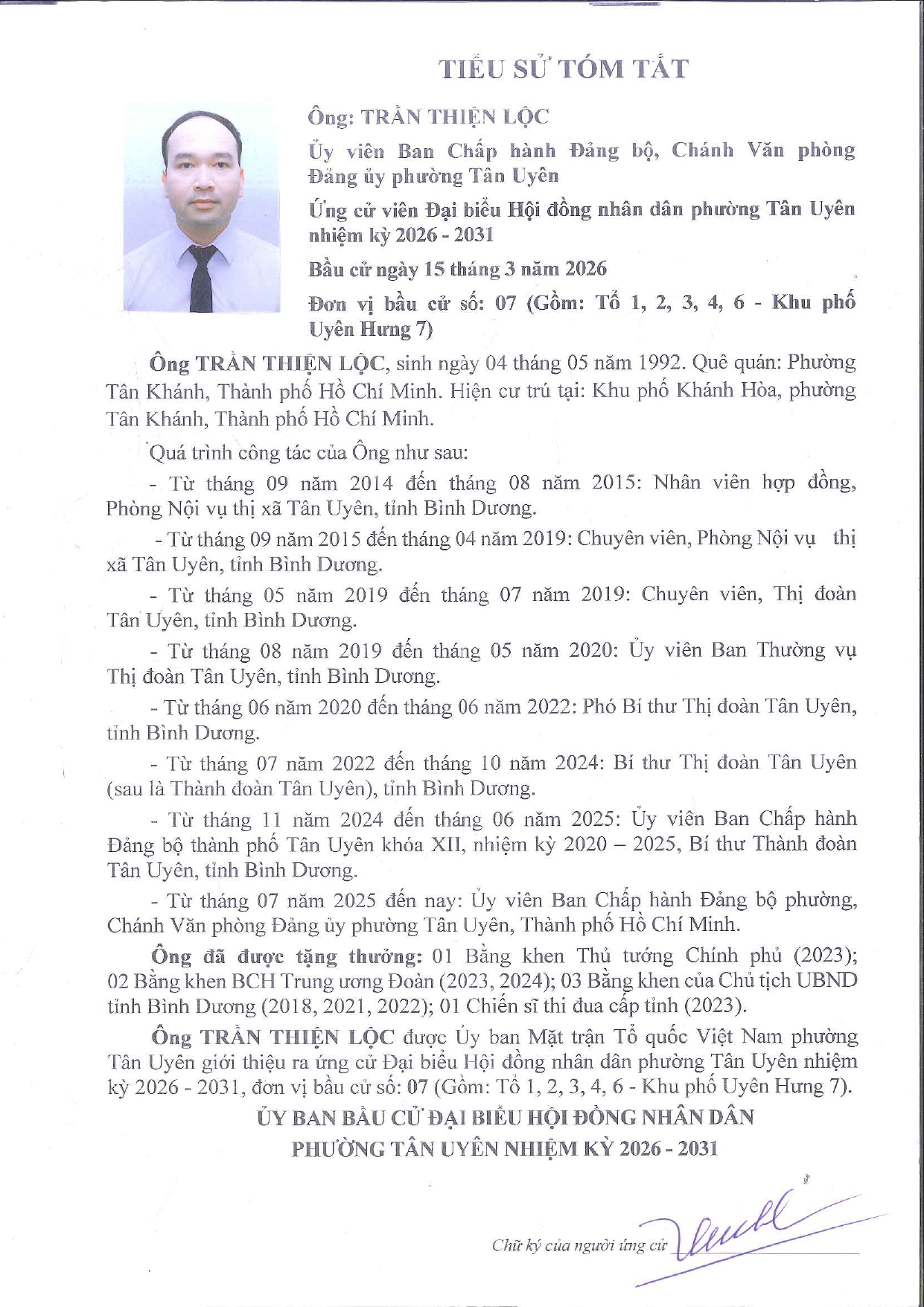 Tiểu sử tóm tắt và Chương trình hành động của ông Trần Thiện Lộc ứng cử viên Đại biểu hội đồng nhân dân phường Tân Uyên khóa II, nhiệm kỳ 2026 – 2031. Đơn vị bầu cử số 07 gồm tổ 1, 2, 3, 4, 6 - khu phố Uyên Hưng 7