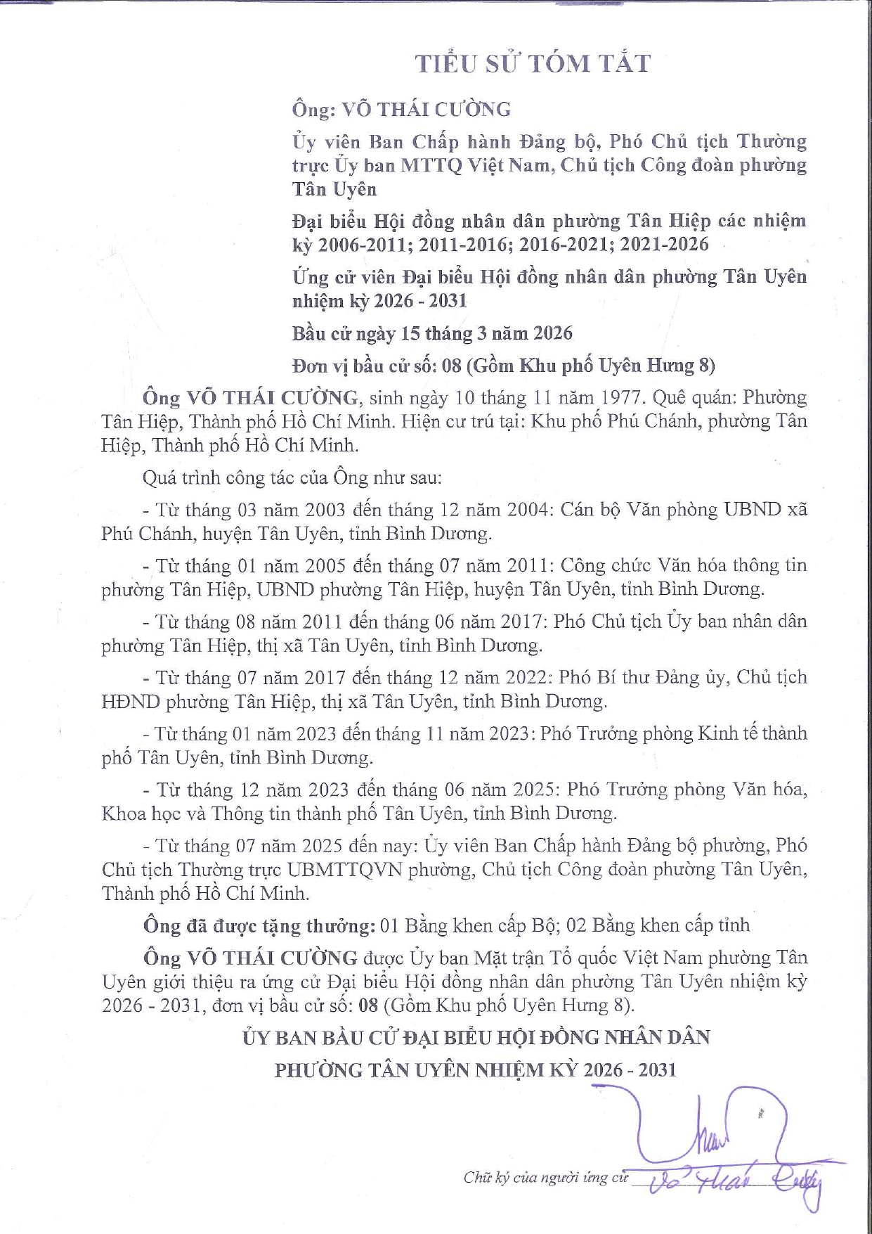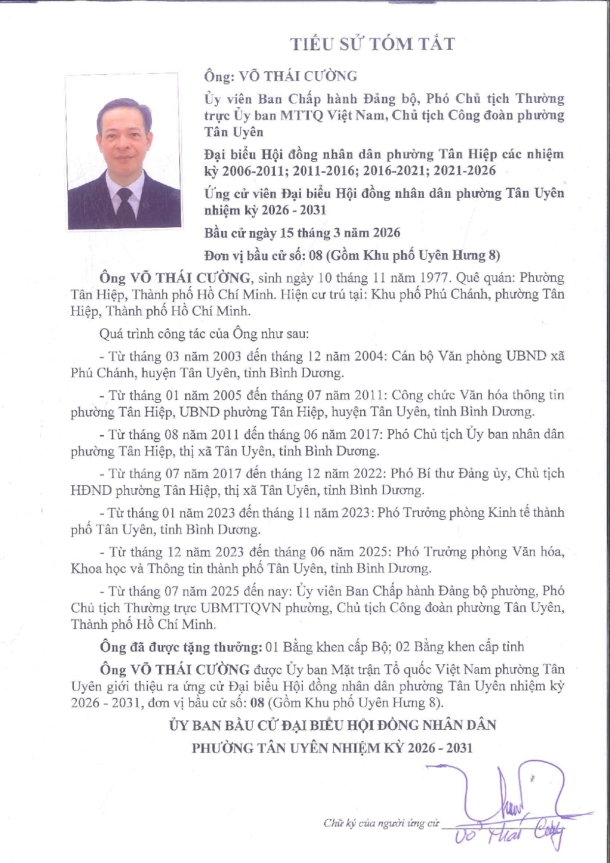 Tiểu sử tóm tắt và Chương trình hành động của ông Nguyễn Thanh Thoại ứng cử viên Đại biểu hội đồng nhân dân phường Tân Uyên khóa II, nhiệm kỳ 2026 – 2031. Đơn vị bầu cử số 08 gồm khu phố Uyên Hưng 8