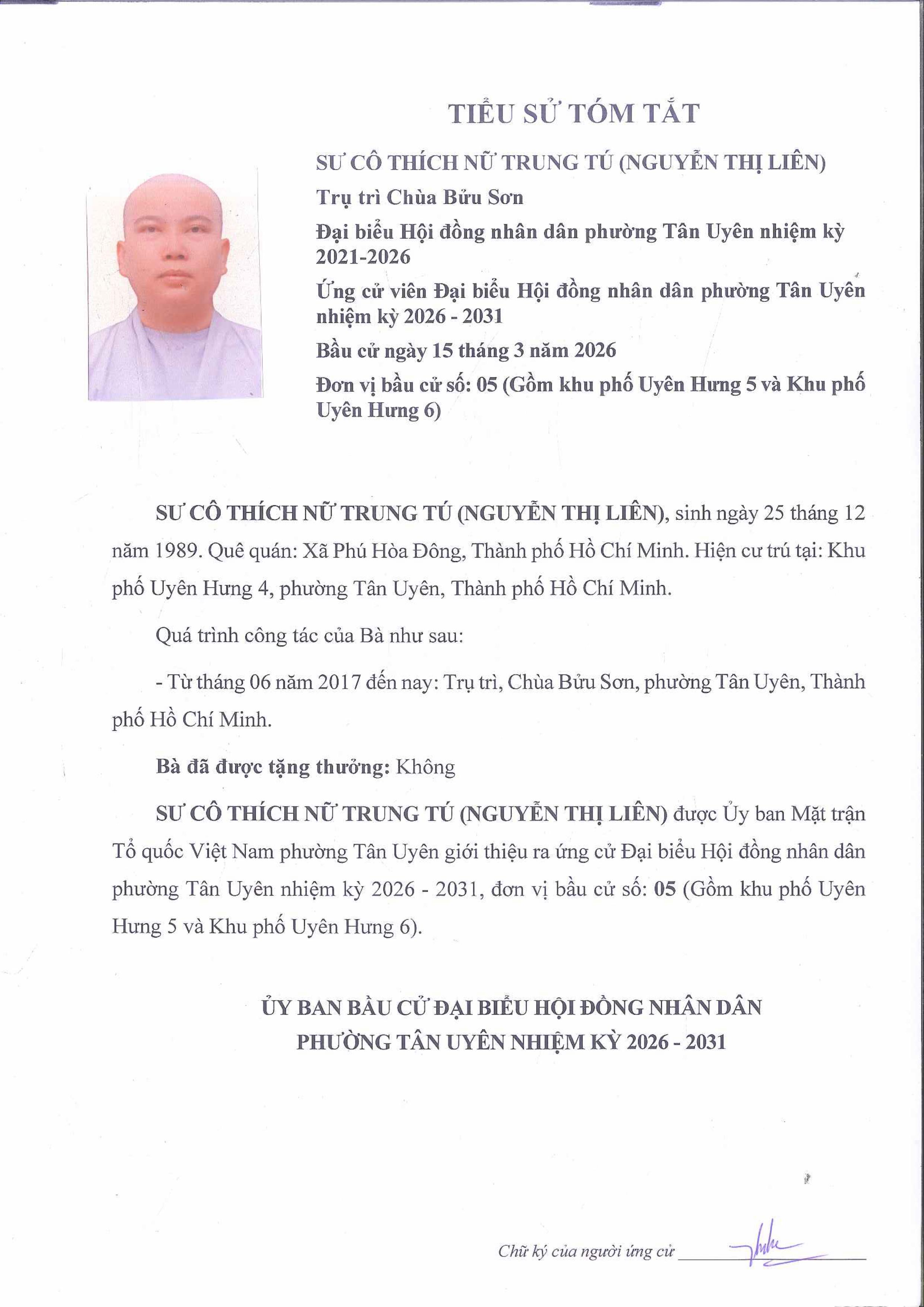 Tiểu sử tóm tắt và Chương trình hành động của sư cô Thích nữ Trung Tú (Nguyễn Thị Liên) ứng cử viên Đại biểu hội đồng nhân dân phường Tân Uyên khóa II, nhiệm kỳ 2026 – 2031. Đơn vị bầu cử số 05 gồm các khu phố: Uyên Hưng 5 và Uyên Hưng 6