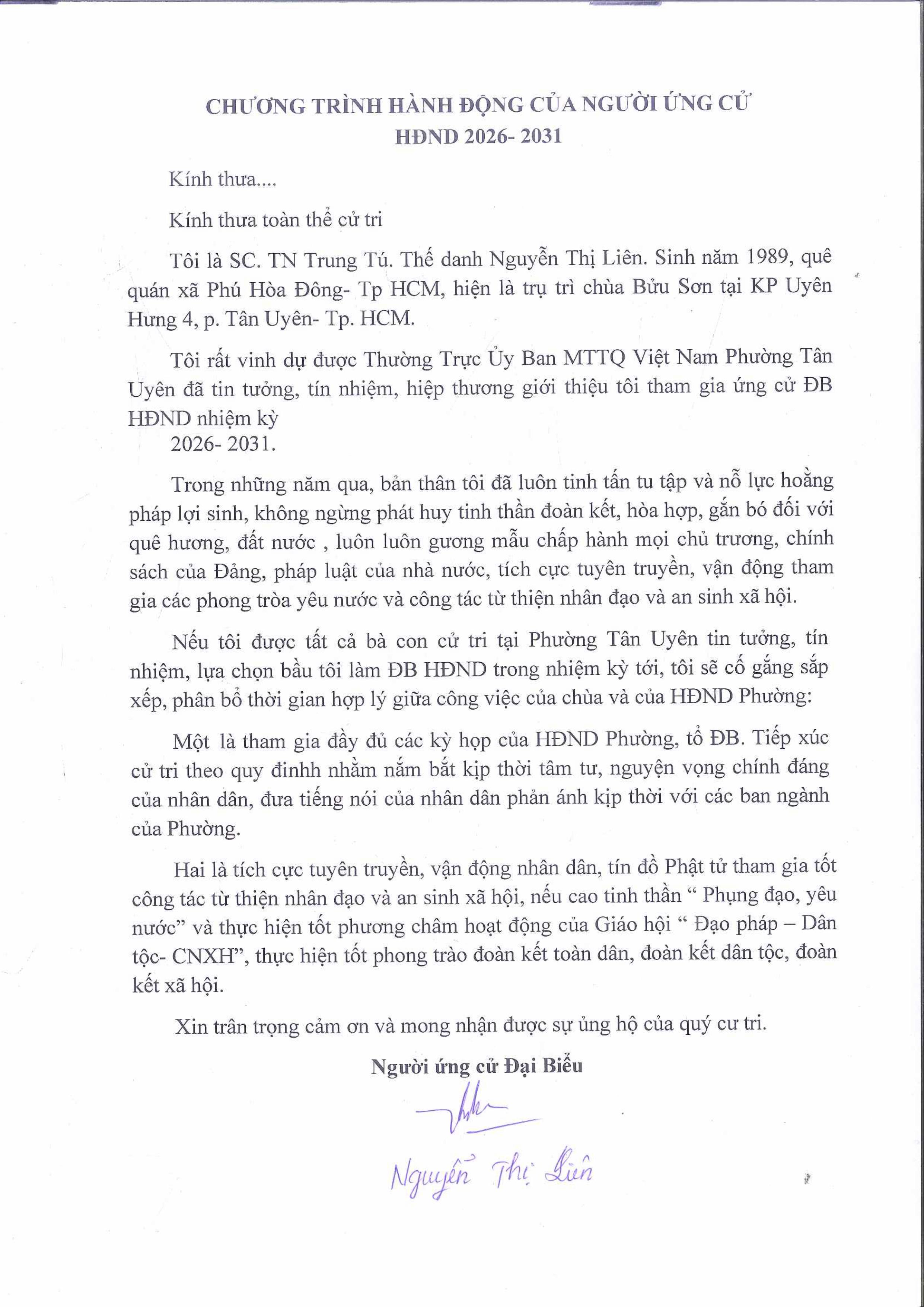 Tiểu sử tóm tắt và Chương trình hành động của sư cô Thích nữ Trung Tú (Nguyễn Thị Liên) ứng cử viên Đại biểu hội đồng nhân dân phường Tân Uyên khóa II, nhiệm kỳ 2026 – 2031
