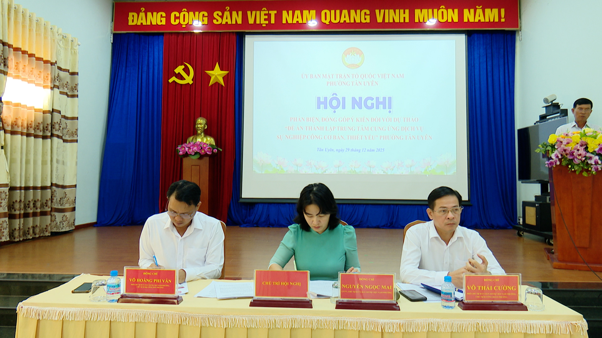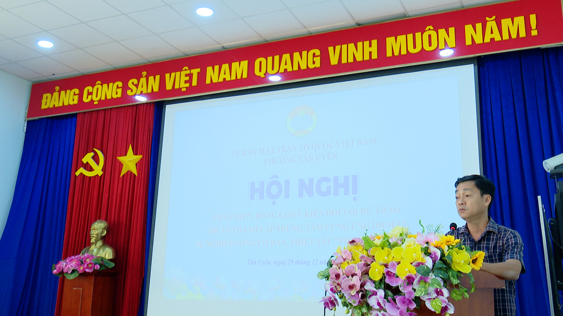 Sáng ngày 29/12, Ban Thường trực Uỷ ban Mặt trận Tổ quốc Việt Nam phường Tân Uyên tổ chức Hội nghị phản biện xã hội đối với dự thảo Đề án thành lập Trung tâm Cung ứng dịch vụ sự nghiệp công cơ bản, thiết yếu phường Tân Uyên trên cơ sở tổ chức lại Trung tâm Văn hóa, Thể thao và Truyền thanh, Nhà Thiếu nhi hiện nay do Ủy ban nhân dân phường Tân Uyên quản lý. Bà Nguyễn Ngọc Mai - Uỷ viên Ban Thường vụ, Chủ tịch Uỷ ban Mặt trận Tổ quốc Việt Nam phường chủ trì hội nghị. Cùng dự có ông Đặng Đình Trí - Uỷ viên Ban Thường vụ, Phó Chủ tịch Uỷ ban nhân dân phường cùng lãnh đạo các cơ quan, các uỷ viên Uỷ ban Mặt trận Tổ quốc Việt Nam phường, đại diện Ban Thường vụ các tổ chức chính trị, xã hội, Trưởng Ban Công tác Mặt trận các khu phố.