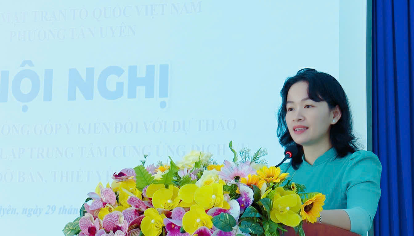 Kết luận hội nghị, bà Nguyễn Ngọc Mai - Ủy viên Ban Thường vụ, Chủ tịch Ủy ban Mặt trận Tổ quốc Việt Nam phường Tân Uyên đề nghị Văn phòng Mặt trận tổng hợp đầy đủ, khách quan các ý kiến đóng góp tại hội nghị để gửi Ủy ban nhân dân phường nghiên cứu, tiếp thu, đồng thời báo cáo Thường trực Đảng ủy phường theo quy định. Bà chia sẻ, đây là hội nghị phản biện xã hội đầu tiên của Ủy ban Mặt trận Tổ quốc Việt Nam phường sau sáp nhập, có ý nghĩa quan trọng trong việc triển khai thực hiện cơ chế phản biện xã hội của Mặt trận trong giai đoạn mới. Hội nghị diễn ra trong không khí dân chủ, nghiêm túc, trách nhiệm, thể hiện sự quan tâm và đồng hành của các đại biểu đối với nhiệm vụ chung của địa phương. Thay mặt Ban Thường trực Ủy ban Mặt trận Tổ quốc Việt Nam phường, bà Nguyễn Ngọc Mai trân trọng cảm ơn các đại biểu đã đóng góp ý kiến đầy tâm huyết, trách nhiệm, góp phần giúp dự thảo Đề án được hoàn thiện. Bà mong muốn Ủy ban nhân dân phường tiếp tục hoàn chỉnh Đề án, nhất là làm rõ kế hoạch, định hướng khai thác, sử dụng hiệu quả các thiết chế liên quan đến việc cung ứng dịch vụ công, bảo đảm tính thực chất, hiệu quả và phù hợp với yêu cầu thực tiễn của địa phương, vì lợi ích của nhân dân.