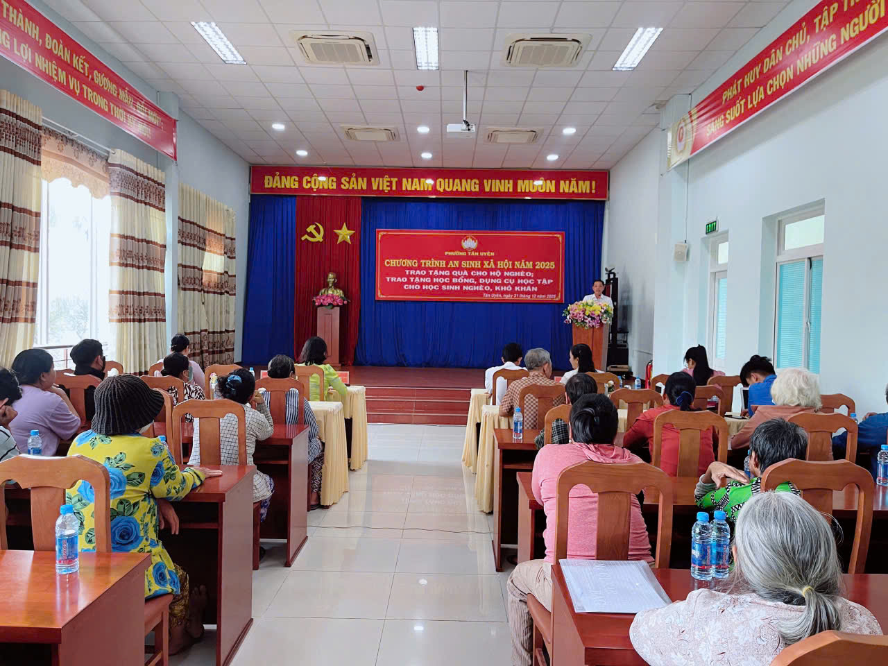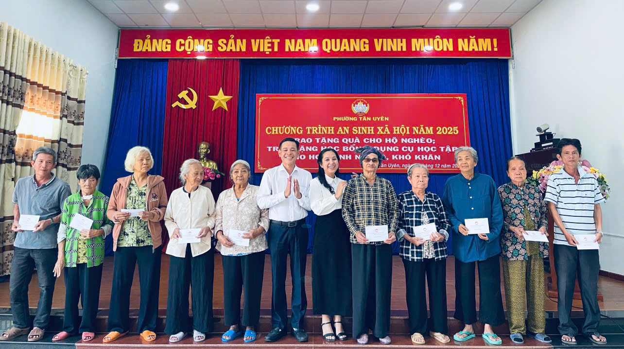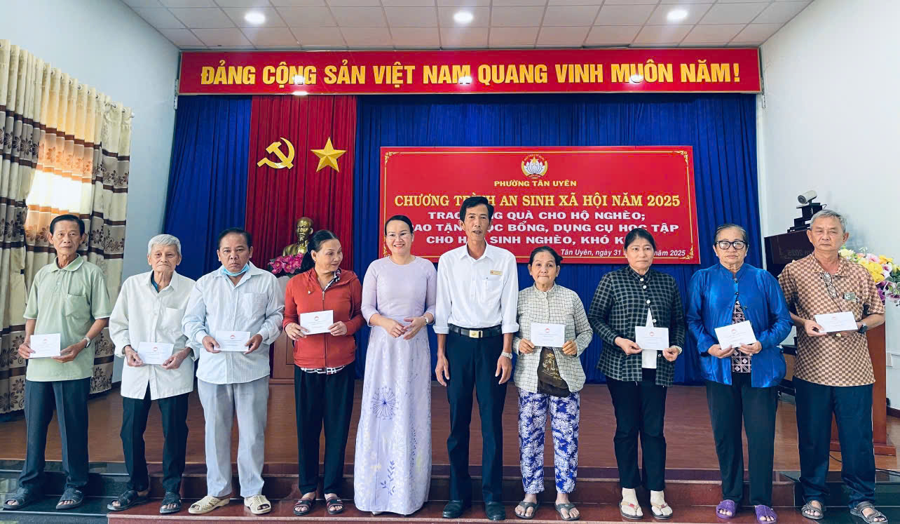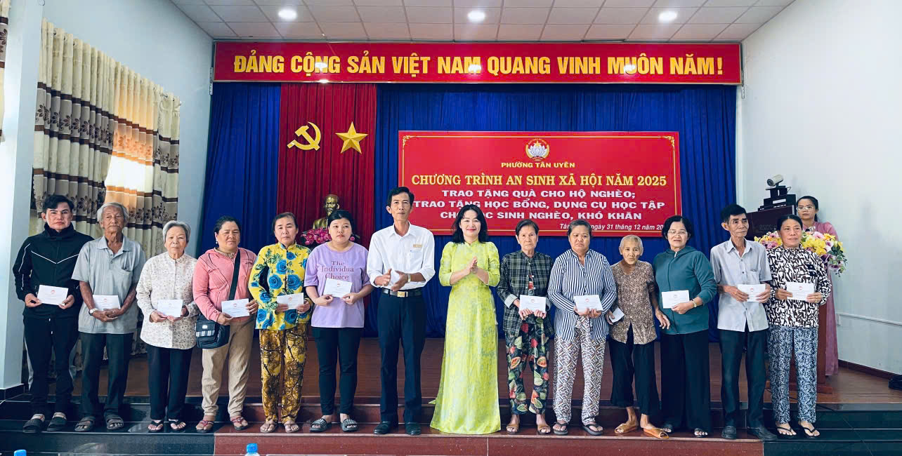 Chiều ngày 31/12/2025, Ủy ban Mặt trận Tổ quốc Việt Nam phường Tân Uyên tổ chức chương trình trao quà an sinh xã hội năm 2025 cho các hộ gia đình có hoàn cảnh khó khăn. Dự buổi lễ có bà Nguyễn Ngọc Mai - Uỷ viên Ban Thường vụ, Chủ tịch Uỷ ban Mặt trận Tổ quốc Việt Nam phường Tân Uyên cùng lãnh đạo các cơ quan, đoàn thể phường.